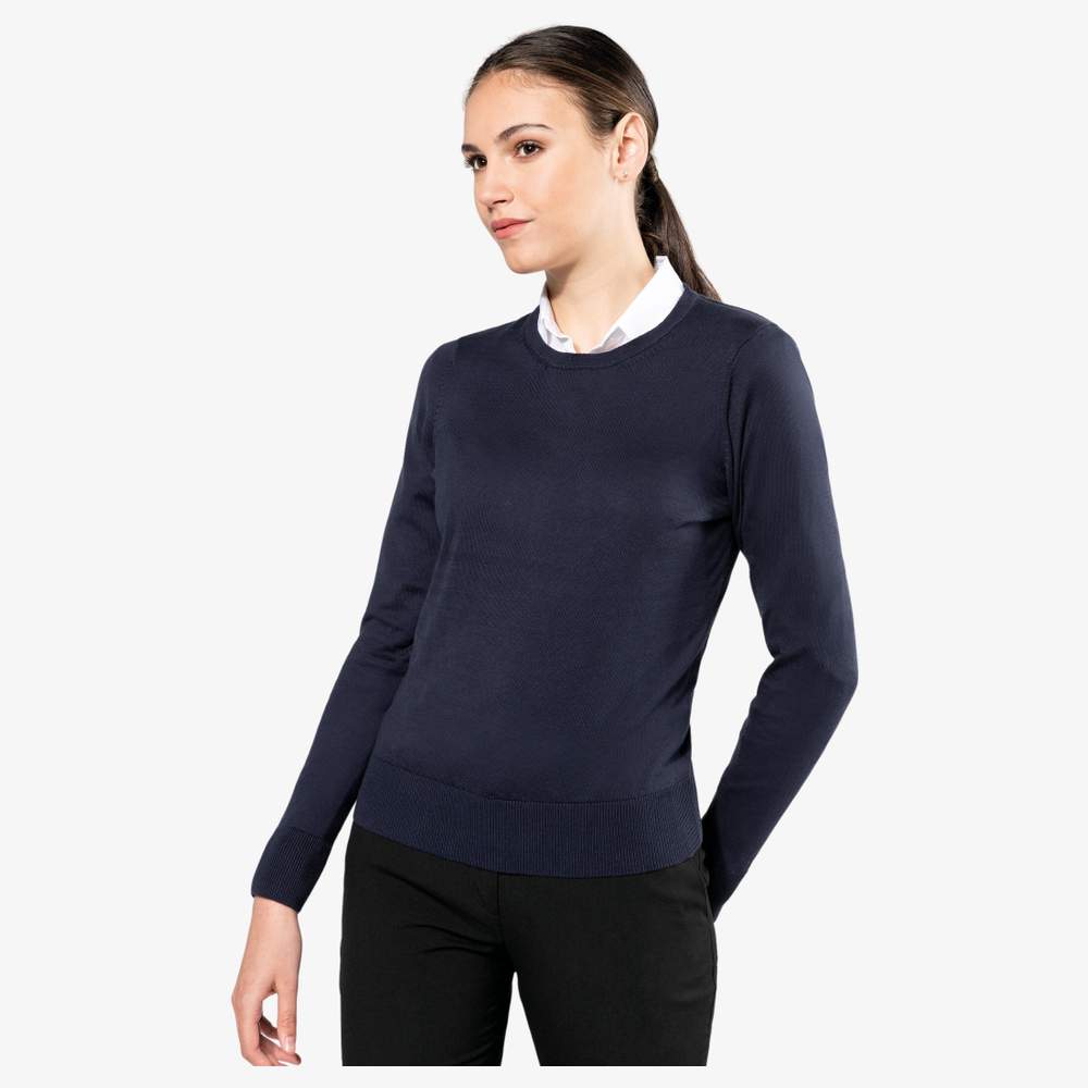 Jersey de cuello redondo para mujer, confeccionado en 100% algodón Supima®. Este tejido de alta calidad ofrece suavidad y confort. La trama 12 asegura una textura refinada. La concepción fully-fashioned permite un ajuste óptimo y una gran libertad de movimiento. El cuello, las muñecas y el bajo de la prenda están terminados con una costura de punto 1 x 1 para mayor durabilidad y confort.