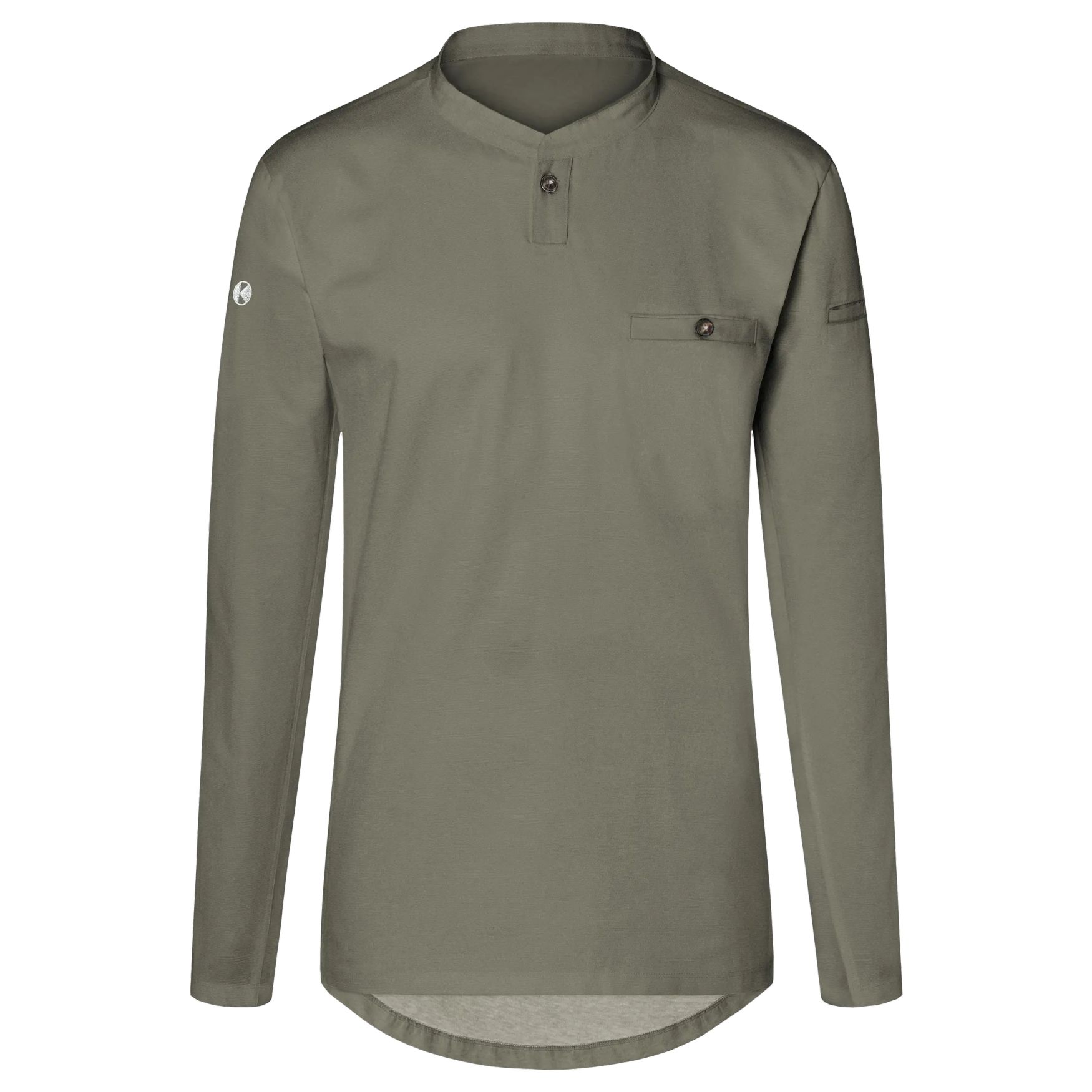 El long-sleeve tee-shirt de manga larga se distingue por un corte entallado y un cuello oficial con ojales. Está diseñado para ofrecer transpirabilidad adecuada en entornos profesionales como cocina, servicio o limpieza. El bolsillo ribeteado en la manga izquierda añade una funcionalidad discreta. La composición es diferente entre el delantero y la espalda: delantero 60 % poliéster, 40 % algodón, espalda 100 % poliéster.