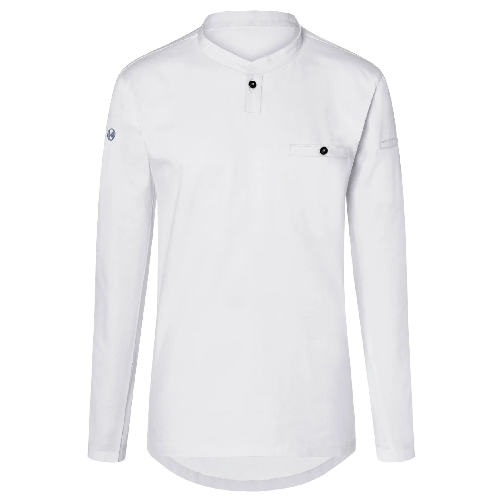 El long-sleeve tee-shirt de manga larga se distingue por un corte entallado y un cuello oficial con ojales. Está diseñado para ofrecer transpirabilidad adecuada en entornos profesionales como cocina, servicio o limpieza. El bolsillo ribeteado en la manga izquierda añade una funcionalidad discreta. La composición es diferente entre el delantero y la espalda: delantero 60 % poliéster, 40 % algodón, espalda 100 % poliéster.