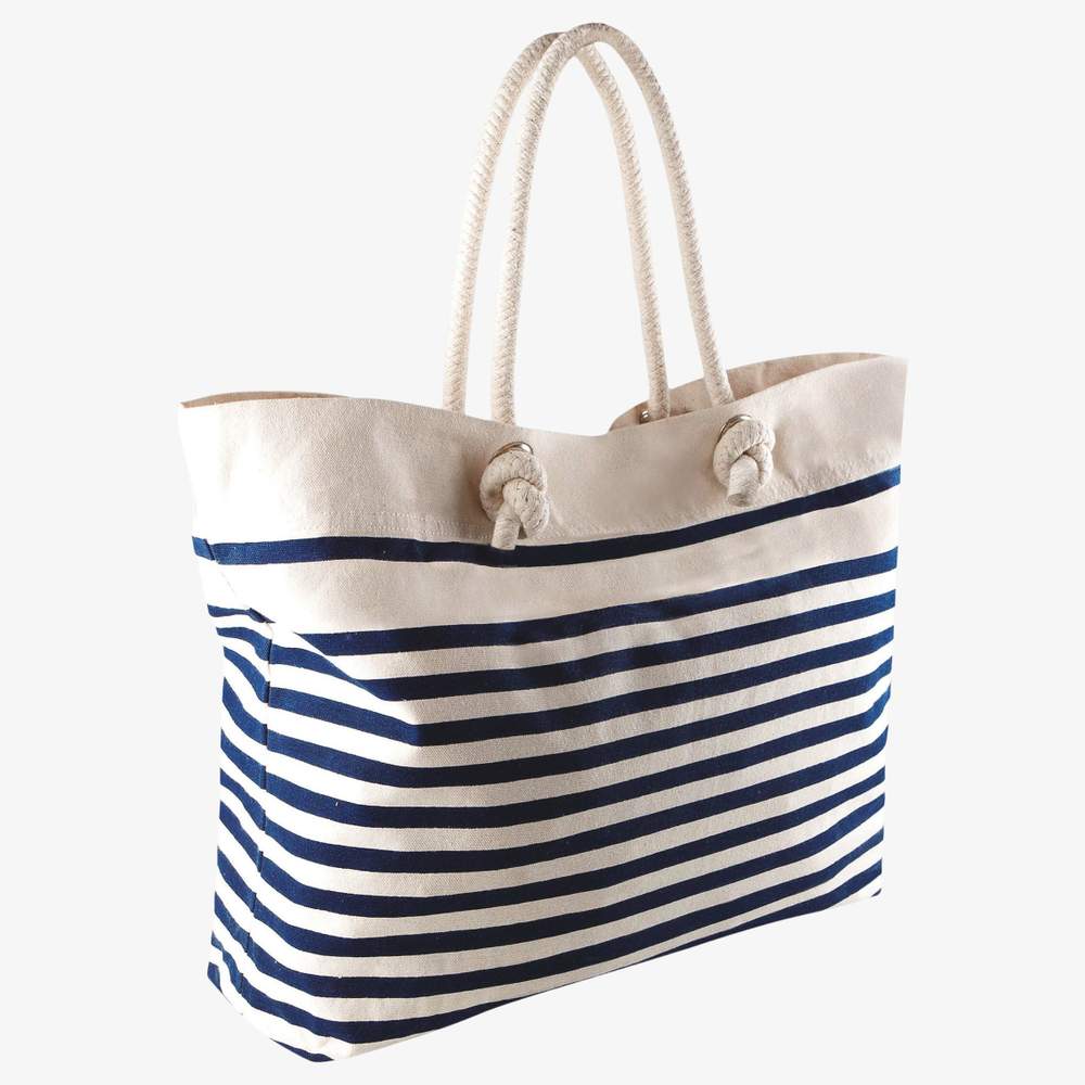 Gran bolsa de playa en algodón canvas estilo marinero. Ofrece un espacio de almacenamiento práctico para los artículos de playa o salidas informales. Está equipada con asas de cuerda de algodón para un transporte fácil, un bolsillo interior con cremallera para asegurar los objetos pequeños y un cierre por botón de presión. Sus dimensiones son de 43x13x36 cm.