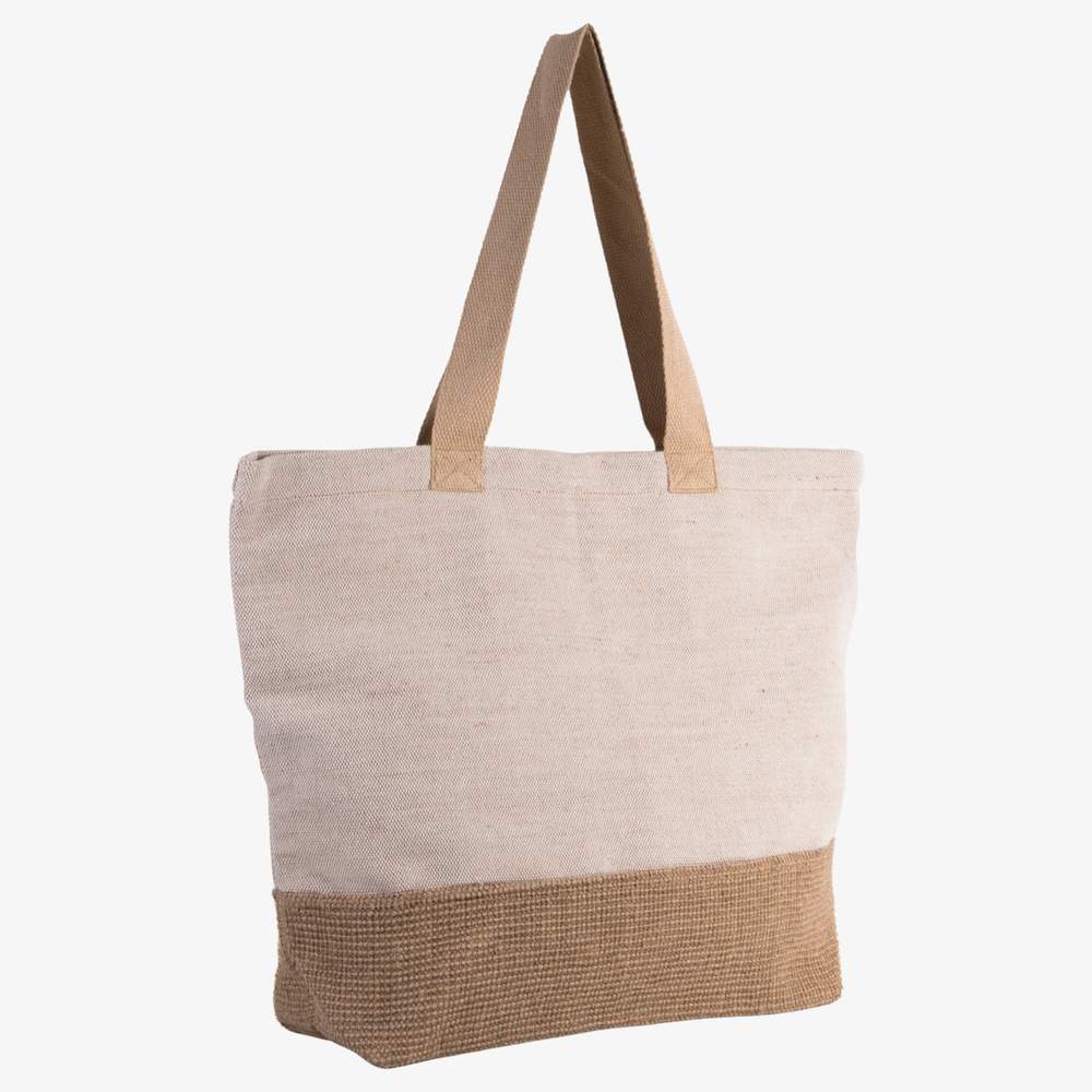 Gran bolsa de compras en algodón y yute (juco) con base de color contrastante en tela de yute. El juco y la tela de yute aportan un tejido con aspecto rústico. Esta bolsa cuenta con un bolsillo interior con cremallera y un cierre magnético. Sus dimensiones son de 52x16x40 cm. Esta bolsa es ideal para transportar tus compras o tus pertenencias personales. También puede ser personalizada con tu logotipo, tu diseño o cualquier otro elemento gráfico para una comunicación efectiva de tu marca. La personalización es posible en una amplia superficie, ofreciendo así una gran visibilidad a tu mensaje.