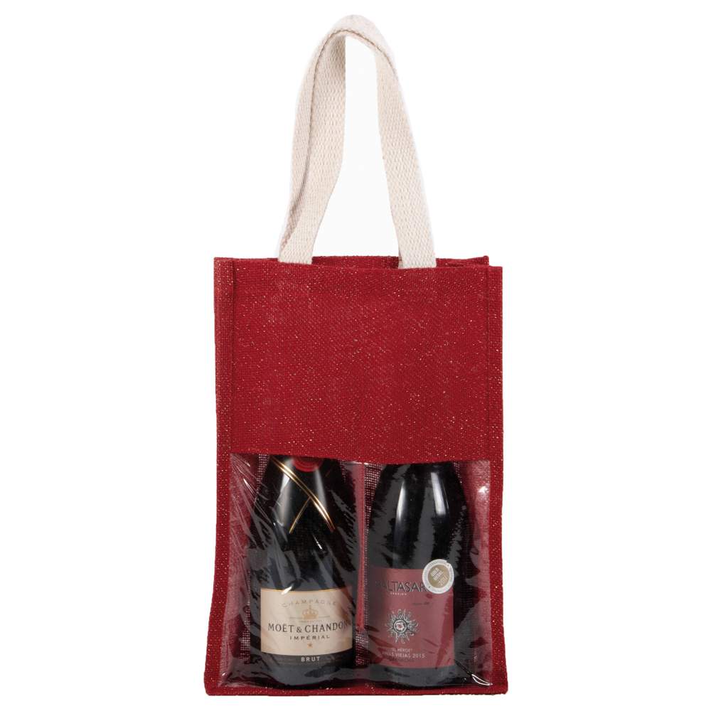 Bolso portabotellas de tela de yute, diseñado para transportar dos botellas. Cuenta con dos asas para facilitar el transporte y una ventana transparente que permite visualizar el contenido. Este bolso ofrece una solución práctica para el transporte de botellas durante diversos eventos o actividades. Sus dimensiones son de 24x10x36 cm.