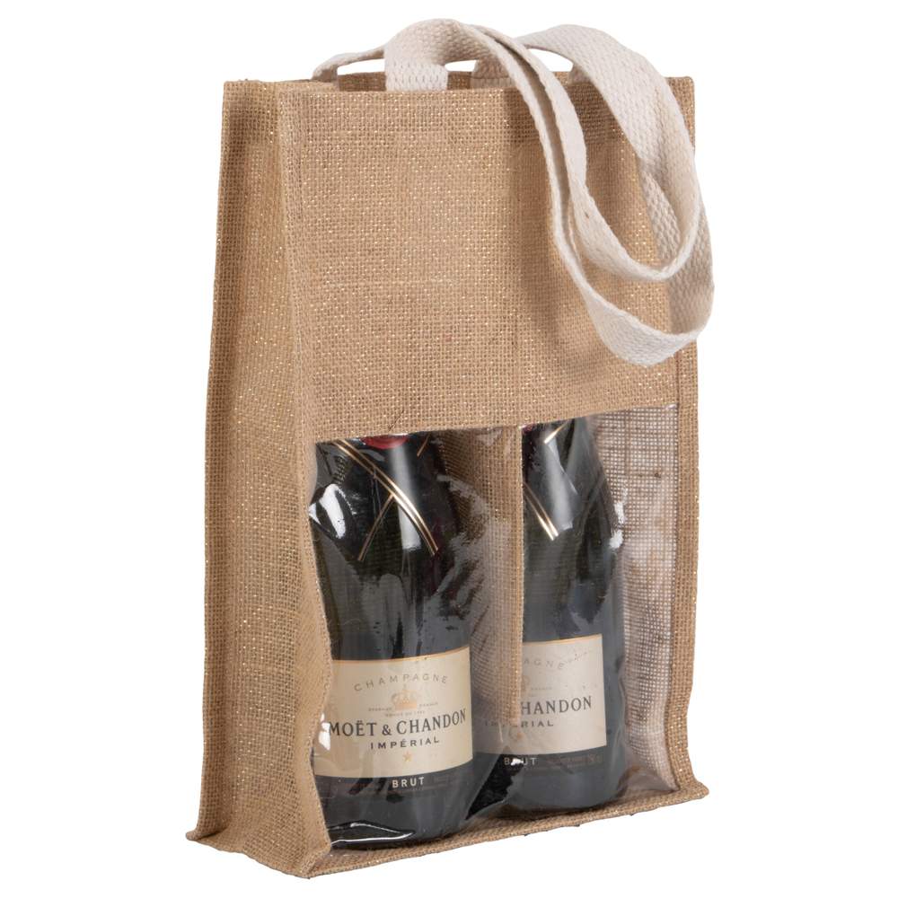Bolso portabotellas de tela de yute, diseñado para transportar dos botellas. Cuenta con dos asas para facilitar el transporte y una ventana transparente que permite visualizar el contenido. Este bolso ofrece una solución práctica para el transporte de botellas durante diversos eventos o actividades. Sus dimensiones son de 24x10x36 cm.
