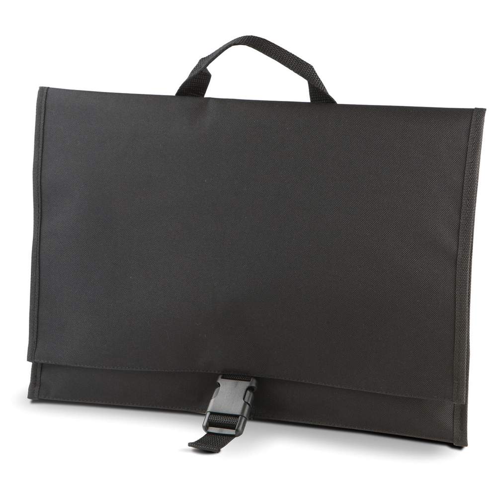 Porta documentos en poliéster 600D revestimiento PVC conforme norma Reach, ofrece una solución práctica y duradera para el transporte de documentos. Cuenta con una solapa con hebilla de cierre que asegura la seguridad del contenido, y un asa en la parte superior que facilita el transporte. Los accesorios son conformes a la norma Reach.