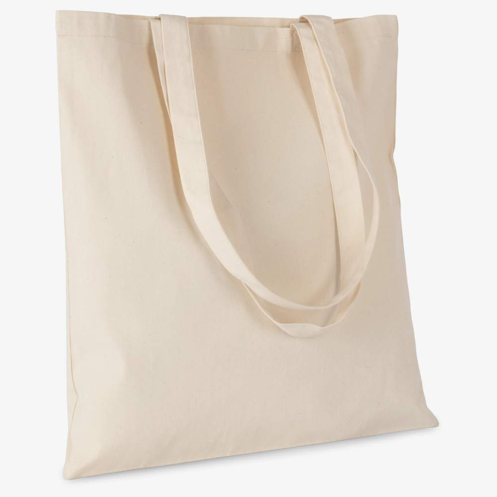 Bolso de compras en algodón sarga. Superficie adaptada para la impresión y personalización. Asas largas: 70 cm. Capacidad: 13 litros. Dimensiones: 38 cm x 42 cm. Composición: 100% algodón sarga.