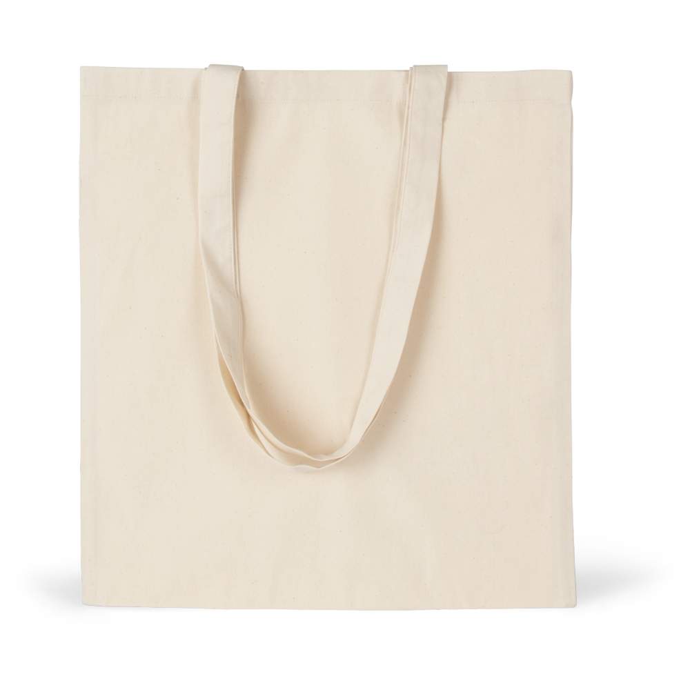Bolso de compras en algodón sarga. Superficie adaptada para la impresión y personalización. Asas largas: 70 cm. Capacidad: 13 litros. Dimensiones: 38 cm x 42 cm. Composición: 100% algodón sarga.