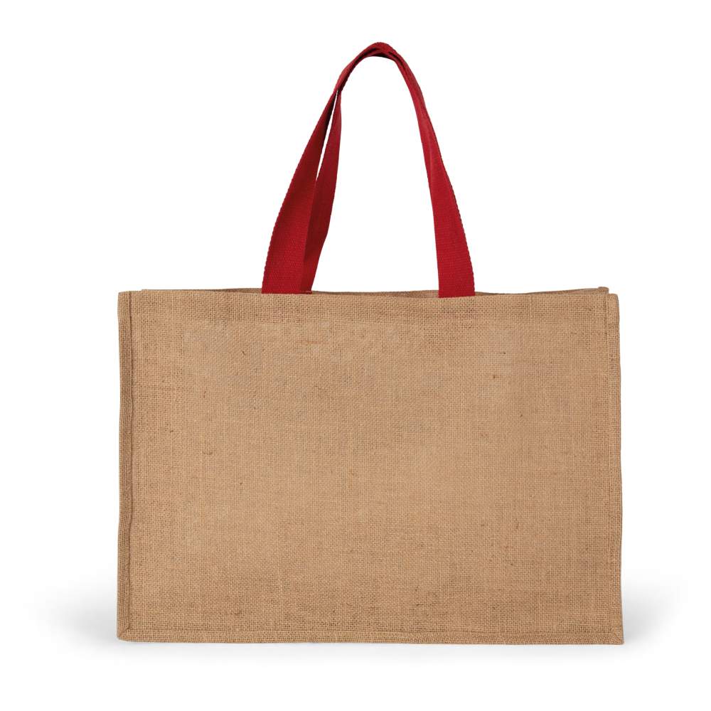 Bolso tamaño XL con asas de color contrastado. El estiramiento con almidón vegetal permite endurecer la yute y, por lo tanto, el bolso, que así mantiene su forma. Capacidad: 35 litros. Dimensiones: 50 cm x 20 cm x 35 cm. Composición: 100% yute.