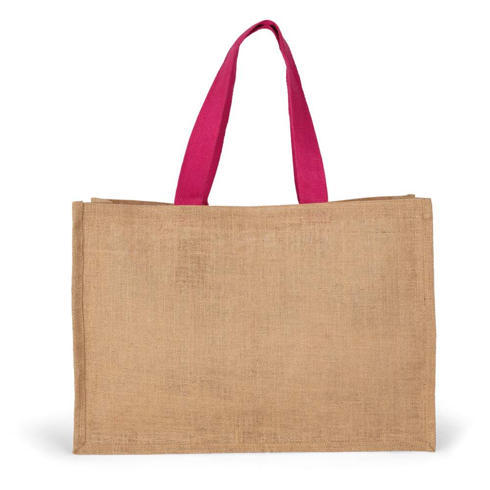 Bolso tamaño XL con asas de color contrastado. El estiramiento con almidón vegetal permite endurecer la yute y, por lo tanto, el bolso, que así mantiene su forma. Capacidad: 35 litros. Dimensiones: 50 cm x 20 cm x 35 cm. Composición: 100% yute.