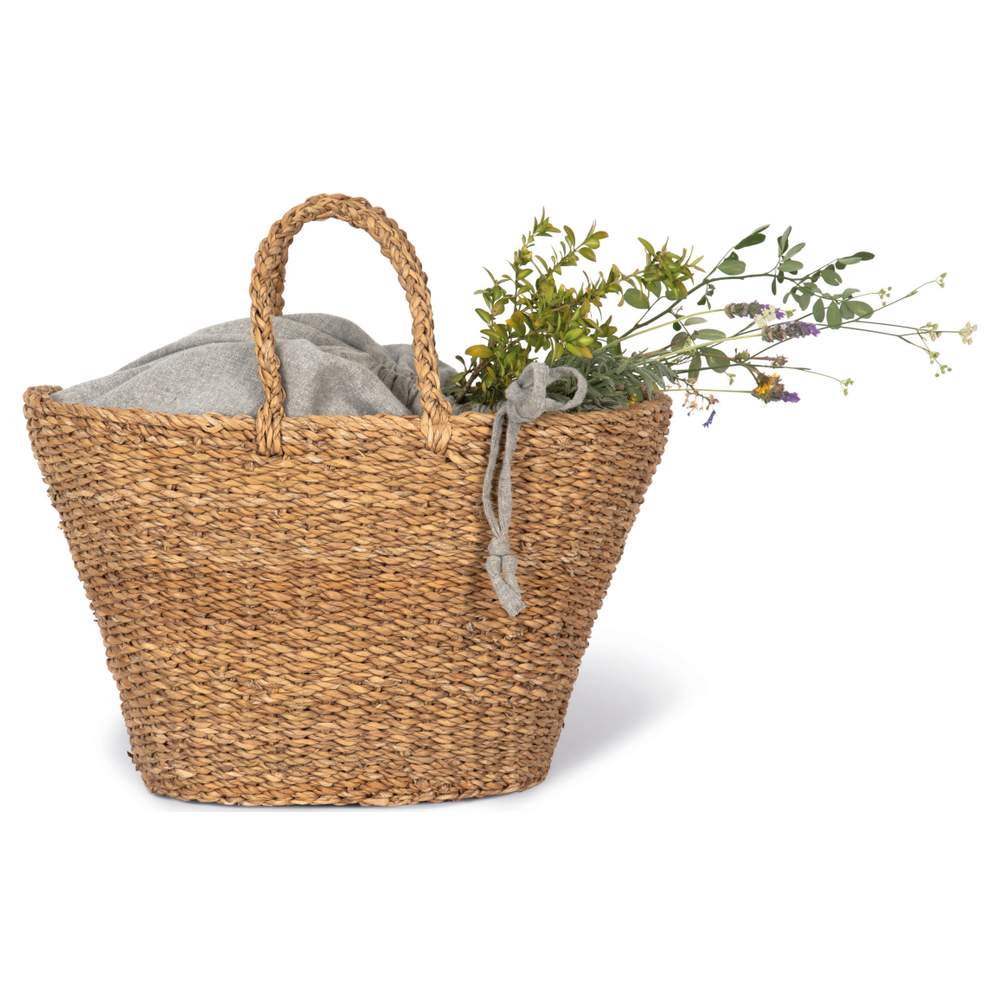 Esta cesta tejida a mano está hecha de fibra vegetal de algas marinas. Su forro interior está tejido a mano con hilo de materiales reciclados (80% algodón, 20% poliéster) en telares tradicionales de Bangladesh, llamado "Tant". Este proceso de fabricación artesanal le da al artículo un aspecto único. La adquisición de este artículo contribuye al apoyo económico de las comunidades rurales de Bangladesh y promueve el empleo femenino local. Esta cesta ofrece una capacidad de 26 litros, lo que la hace práctica para diversos usos.
