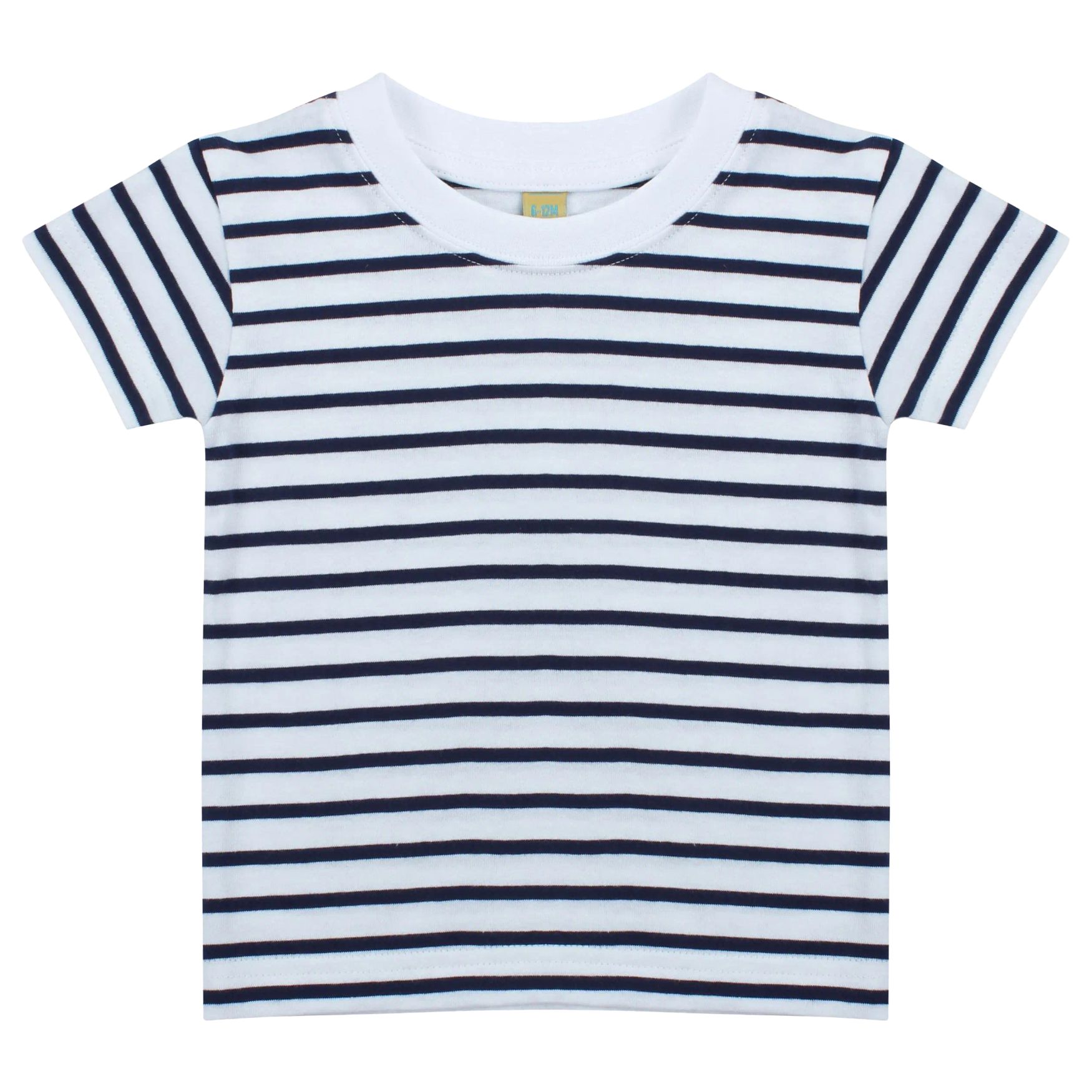 La camiseta infantil de rayas lw027 es un modelo para bebé con motivo marinero, mangas rectas y cuello blanco. Su corte sencillo es adecuado para un uso diario. Las dobles costuras en el cuello, las mangas y el bajo aportan un acabado limpio. Una etiqueta de talla está colocada en el cuello.