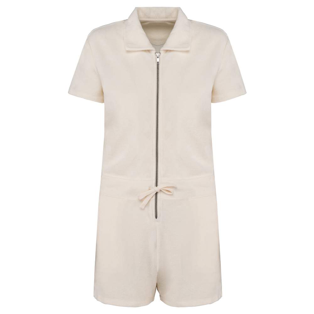 Combinación Terry Towel para mujer. Fabricado en Portugal. Algodón cardado. Material esponja. Lavado con enzimas. Corte recto. Acabado cuello con banda de limpieza en chevrones tono sobre tono. Dobladillo doble aguja en acabado bajo de mangas y bajo de prenda. Cinturón plano con cordón de ajuste en la cintura y ojales bordados para el paso del cordón. Cierre medio delantero con cremallera de metal reciclado. Dos bolsillos laterales en la cintura con sobrehilo en la apertura del bolsillo. Media luna en la espalda. Composición: 80% algodón biológico y 20% poliéster reciclado post-consumer. Posibilidad de personalización en bordado.