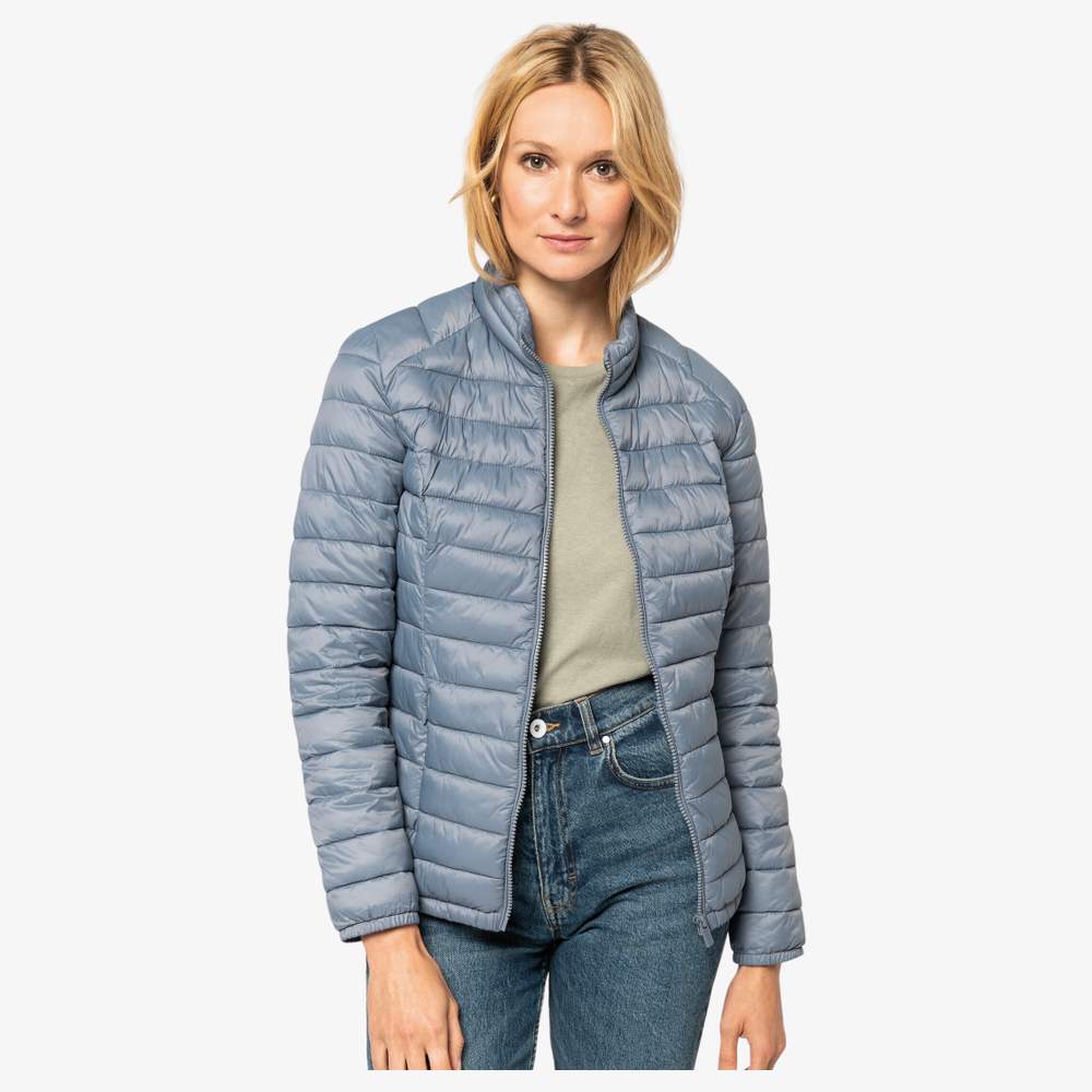Chaqueta reciclada ligera para mujer. Corte recto ligeramente ajustado. Tacto suave y liso. Impermeable nivel 4 y cortavientos mm/s. Cuello alto. Dos bolsillos laterales con cremalleras invisibles en nylon reciclado, dos bolsillos interiores. Cremallera principal en plástico reciclado tono sobre tono. Bajo de la prenda y bajo de las mangas elásticos. Empalme lateral y hombros. Llevado con bolsa de almacenamiento. Relleno efecto plumón en 50% Sorona® y 50% poliéster reciclado. Sorona® es una marca registrada por Affiliates of DuPont de Nemours, Inc. utilizada bajo licencia. Composición: 100% poliamida reciclada.