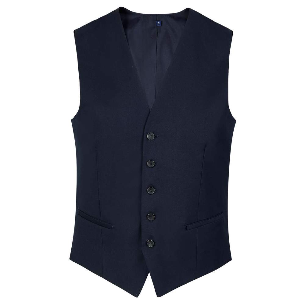 Chaleco de traje hombre. Presenta un diseño de 5 botones y está equipado con 2 bolsillos frontales con ribete para un aspecto cuidado. Una solapa de ajuste en la espalda con hebilla metálica permite ajustar el corte. Este chaleco está fabricado en Twill 204, ofreciendo una buena sujeción y un aspecto texturado. La composición es de 66% poliéster y 34% viscosa, asegurando confort y durabilidad. El forro y la espalda son de 100% poliéster tafetán 210T.