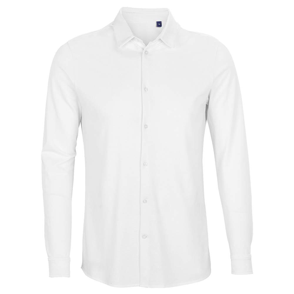 Camisa confeccionada en algodón piqué para hombre. Presenta mangas largas y un cuello clásico. Las muñecas son redondeadas y disponen de dos botones ajustables. La solapa de botones cuenta con siete botones del mismo tono. Este modelo ofrece una comodidad óptima para un uso diario.