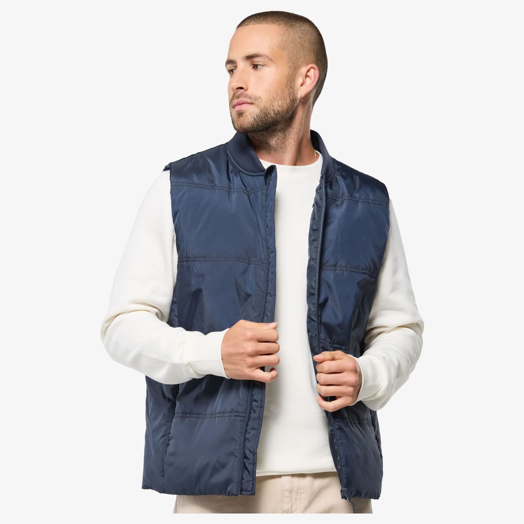 El chaleco cortavientos Bosco es unisex con cuello de canalé y varios bolsillos con cremallera, uno interior. Está compuesto por un exterior 100 % poliéster y un interior 100 % poliéster 300t. La guata utilizada es reciclada.
