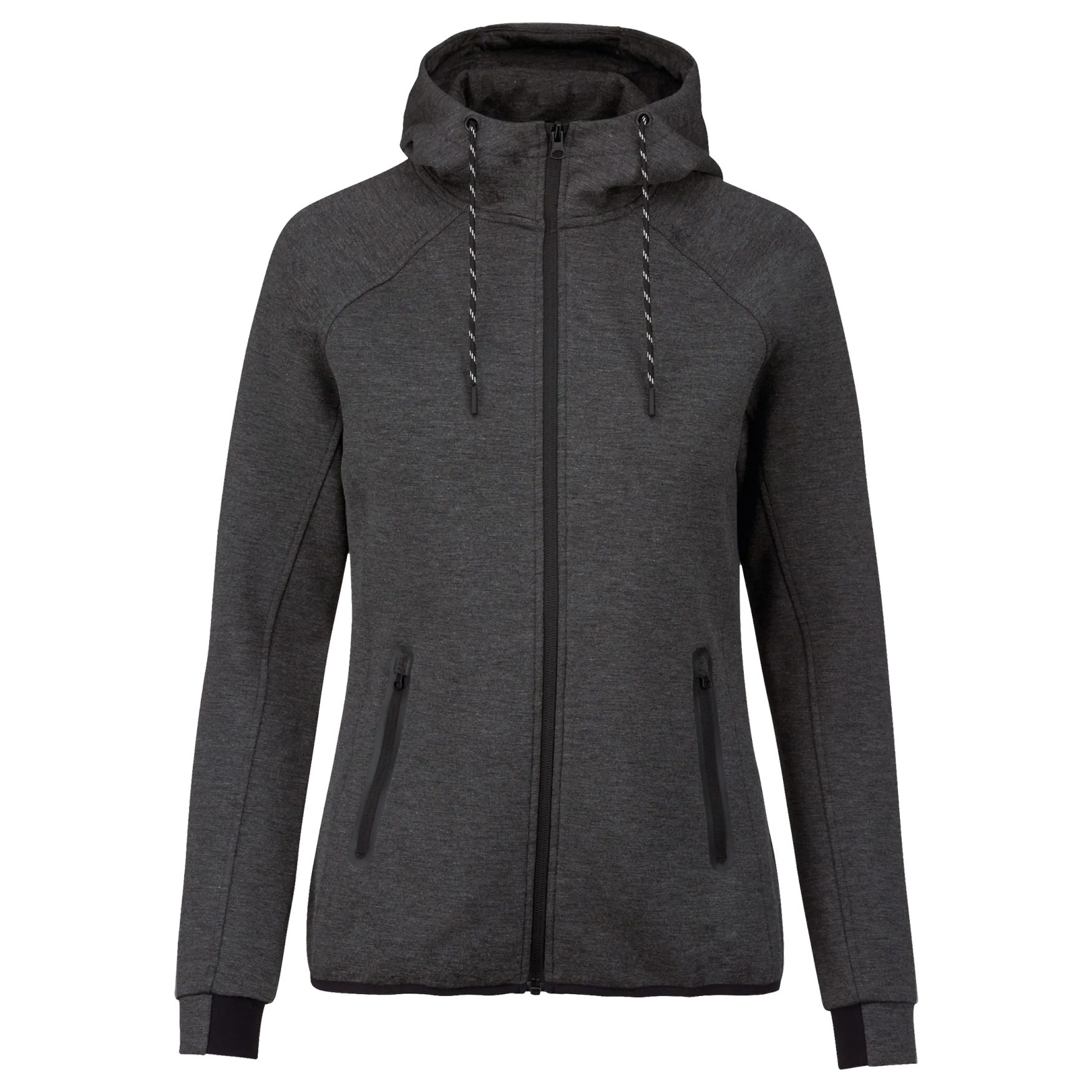 Esta chaqueta con capucha para mujer combina confort y funcionalidad. Confeccionada en poliéster elástico algodón, ofrece una sensación agradable al uso. Tiene un cierre con cremallera, dos bolsillos delanteros con cremallera con una terminación termosoldada y una capucha forrada de jersey de poliéster y algodón, equipada con un cordón de ajuste con puntas de plástico. Las mangas inferiores están ajustadas con una parte elástica contrastada y la parte inferior de la prenda está terminada con una cinta contrastada.