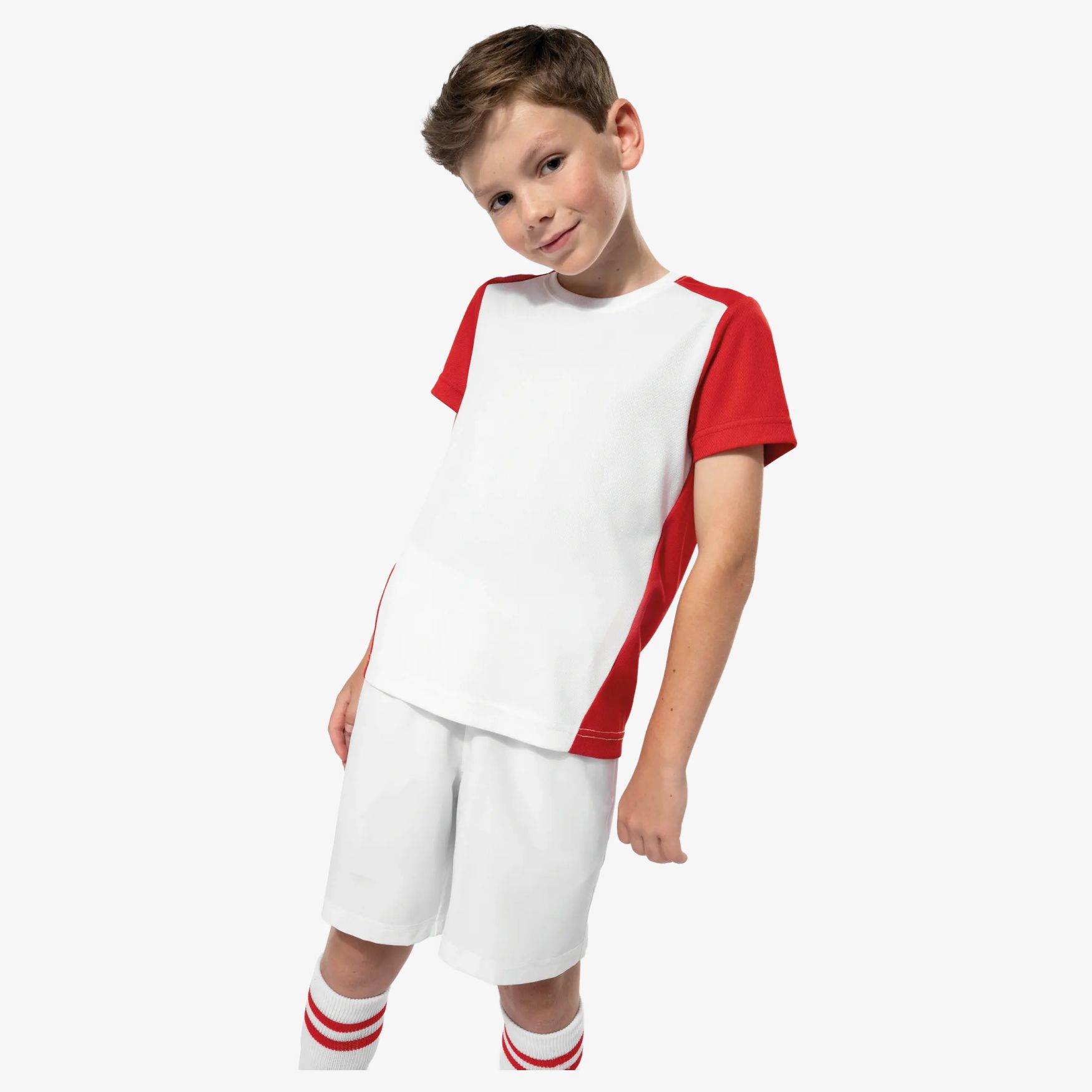 La camiseta deportiva bicolor es un tee-shirt de tejido ligero y secado rápido, con corte entallado, cuello redondo con cinta de refuerzo interior y mangas montadas. Paneles en contraste en hombros, mangas y espalda, con sección al bies en la parte delantera. Composición: 100% poliéster birdseye reciclado post-consumo.