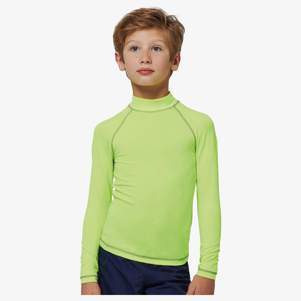 Camiseta técnica de manga larga diseñada para niños que practican actividades deportivas. Su corte ajustado y su tejido elástico aseguran un confort óptimo. Ofrece una protección UV50+ según la norma EN13758-1&2. Las mangas largas raglan con costuras contrastadas y el cuello alto añaden un toque de estilo. Un elástico integrado en el dobladillo permite fijar el cordón del pantalón corto para una mayor estabilidad. Los acabados en las mangas y en el bajo de la prenda están realizados con doble aguja para una mayor durabilidad. La etiqueta de marca desprendible facilita la personalización. Esta camiseta está compuesta por 88% de poliéster reciclado y 12% de elastano.