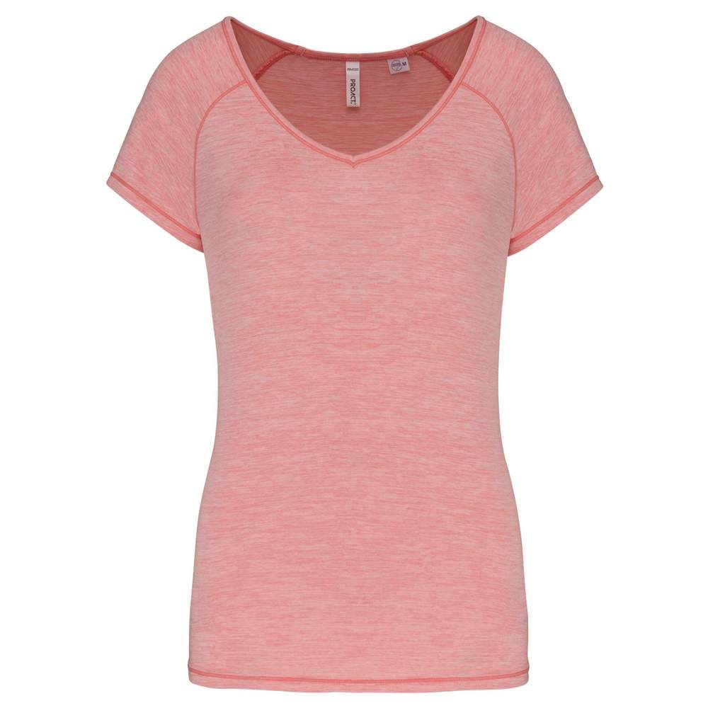 Camiseta de deporte ecoresponsable para mujer. Esta camiseta presenta un corte ajustado y un escote en V con un acabado de cuello. Las mangas raglán ofrecen una mayor libertad de movimiento. Las costuras están realizadas con un punto de cobertura en el escote, en las mangas, en el bajo de las mangas y en el dobladillo de la prenda. Un chip de tamaño está integrado en el escote. La etiqueta de la marca está diseñada para ser fácilmente retirada para facilitar la personalización.