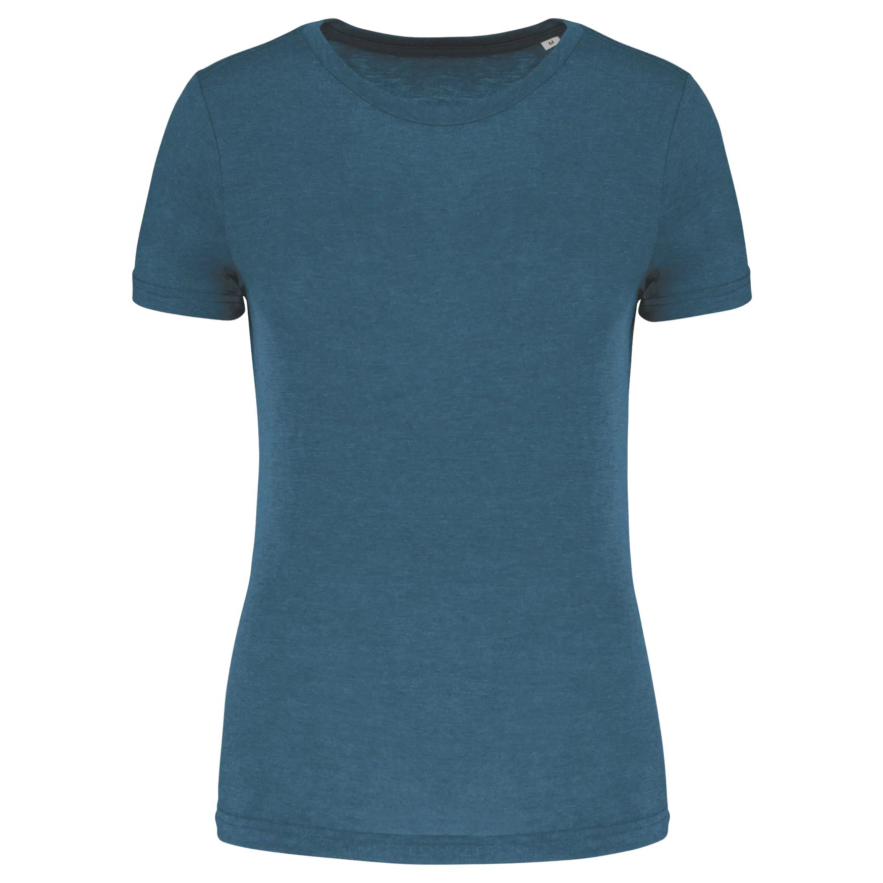 Camiseta de deporte para mujer. Triblend, tela jersey. Tratamiento anti-pelusas. Cuello redondo. Corte recto. Banda de propiedad hombro-cuello espalda-hombro en tono sobre tono. Terminación doble aguja en bajo de mangas y de prenda. Terminación tubular en el bajo del dobladillo y bajo de manga. Sin etiqueta de marca en el cuello, únicamente una chapa de tamaño para facilitar la personalización.