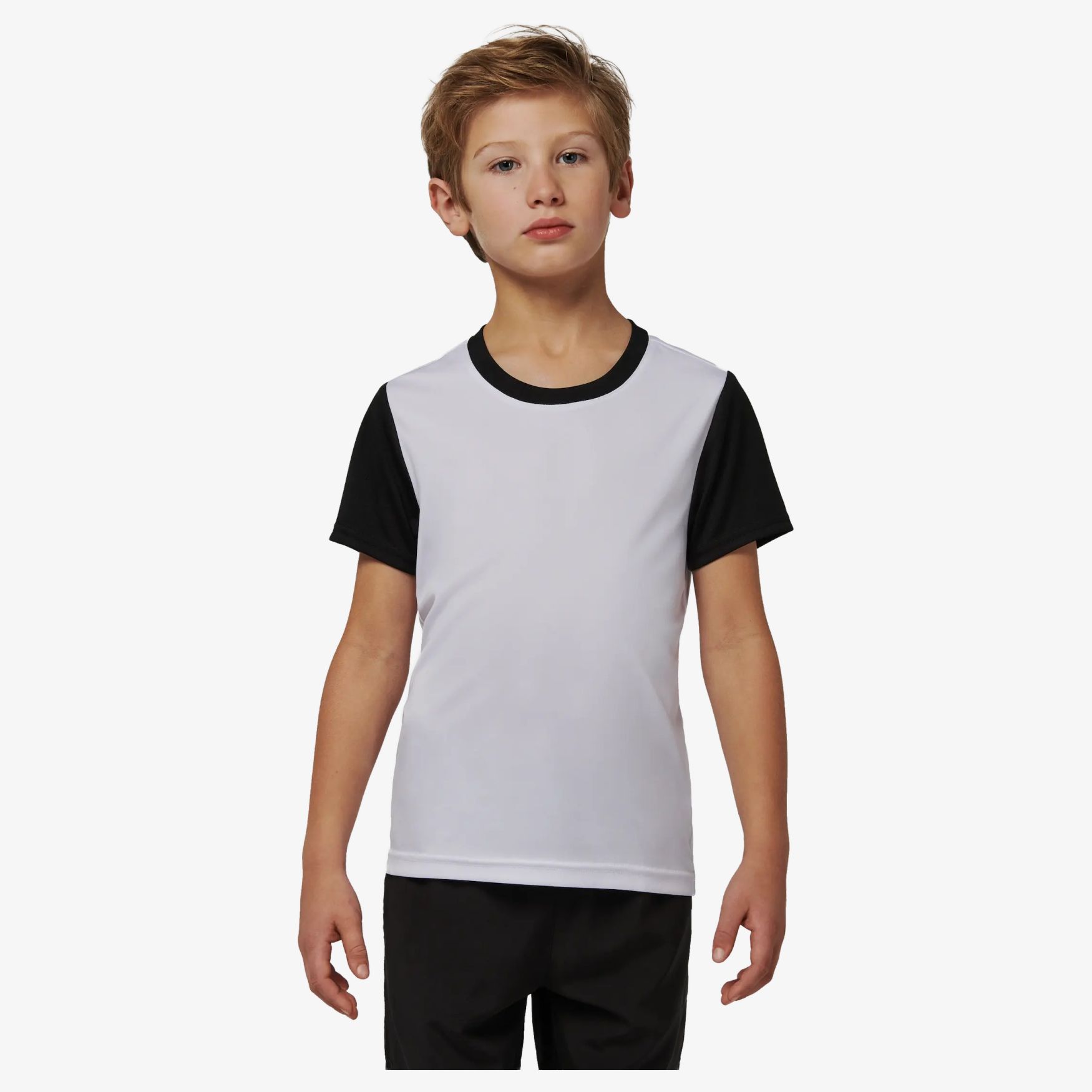 Esta camiseta de mangas cortas bicolor está diseñada para niños que practican actividades deportivas. Su corte recto asegura un confort óptimo durante el esfuerzo. El cuello redondo contrastado y las mangas rectas aportan un toque de estilo. Los acabados doble aguja refuerzan la durabilidad del vestido. Está confeccionada en punto interlock para un mayor confort.
