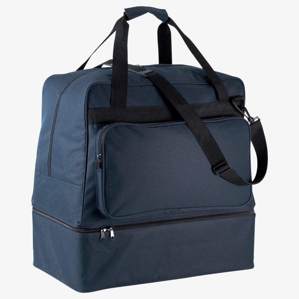 Bolsa de deporte con una capacidad de 90 litros, diseñada en poliéster 600D para una buena resistencia. Está equipada con una base rígida desmontable en polipropileno, asegurando una estabilidad aumentada y facilitando el almacenamiento. La base rígida está dotada de pies de plástico para una mejor protección del contenido. Un bolsillo con cremallera en el frente permite un acceso fácil a los efectos personales. La bolsa también está equipada con una correa para el hombro desmontable con un cojín de silicona para un transporte cómodo. La base rígida se entrega con la bolsa.