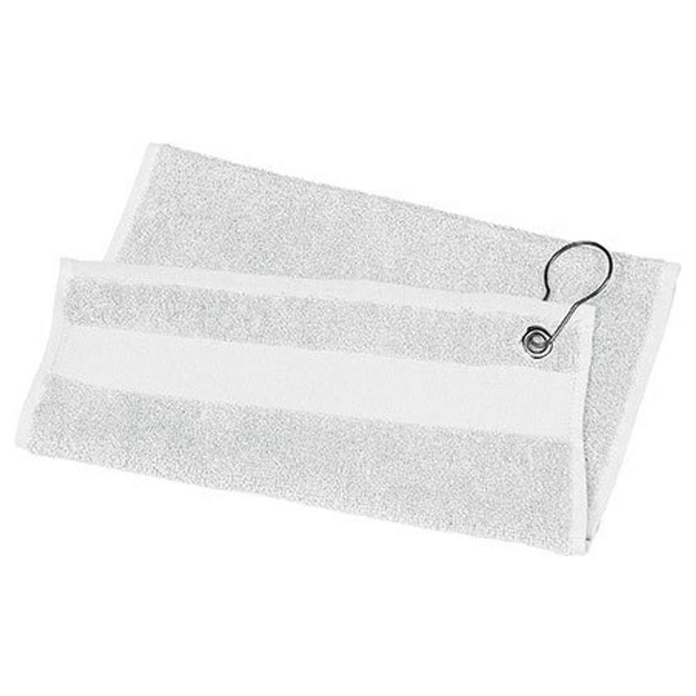 Toalla de golf confeccionada en 100% algodón. Dotada de un ojete de metal en el lado para una fijación fácil. Vendida con un gancho. Esta toalla es un accesorio práctico para limpiar los palos y las bolas durante una partida de golf. Su tamaño permite una buena absorción y un secado rápido. Dimensiones : 50 x 30 cm.