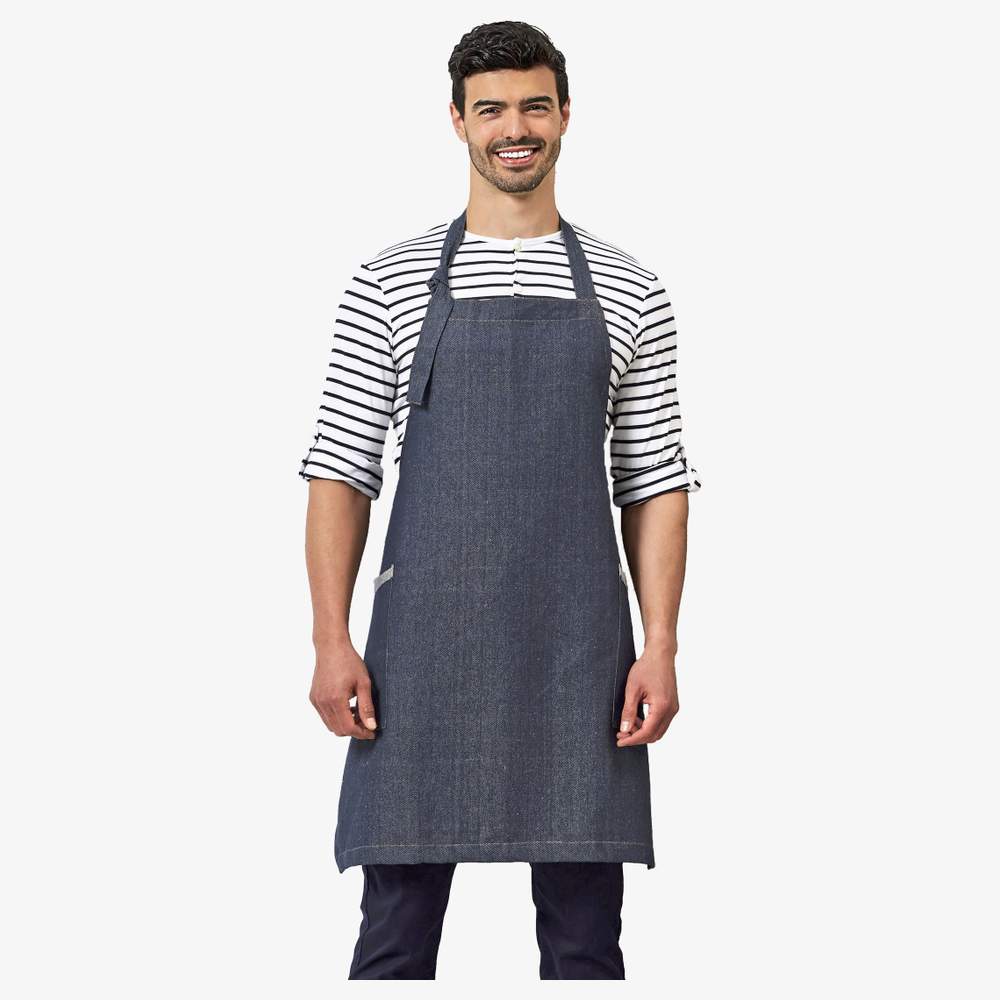 Este delantal con babero está confeccionado a partir de denim regenerado, tejido en telares manuales en una fábrica de bajo consumo de carbono. Presenta dos bolsillos laterales prácticos (23 cm de profundidad x 17,5 cm de ancho) con un borde contrastante, así como un cuello ajustable atado. El tejido ofrece una sensación suave al tacto, evocando la del lino. La composición incluye algodón reciclado, poliéster reciclado y viscosa reciclada.