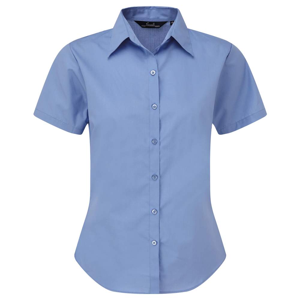 Camisa de manga corta para mujer, diseñada con tejido de popelina para un fácil mantenimiento. Presenta un cuello suave y un corte ceñido con pinzas para una silueta favorecedora. Este modelo está compuesto por 65% poliéster y 35% algodón.