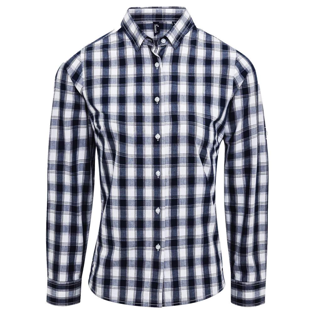 Camisa de cuadros para mujer, diseñada en algodón. Ofrece un corte semiajustado y un cuello suave. Las mangas pueden enrollarse y fijarse gracias a un botón y una solapa. Este modelo completa la referencia masculina PR249.