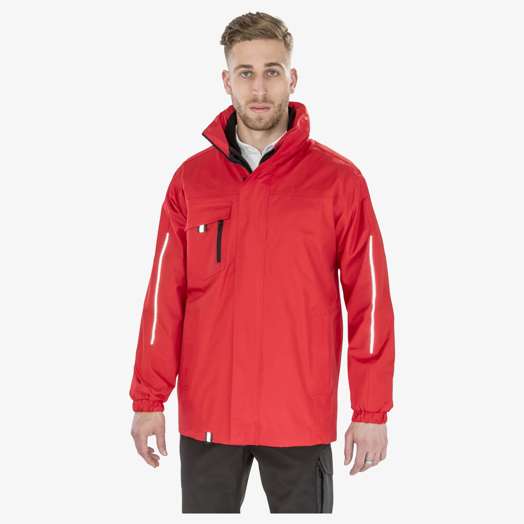 La chaqueta Transit 3 en 1 r236x reúne una chaqueta exterior y una chaqueta interior softshell unidas por una cremallera adicional. El conjunto es adecuado para el uso diario con costuras termoselladas, cierre de cremallera de 2 direcciones, capucha en el cuello, bolsillos interiores y acabados reflectantes.