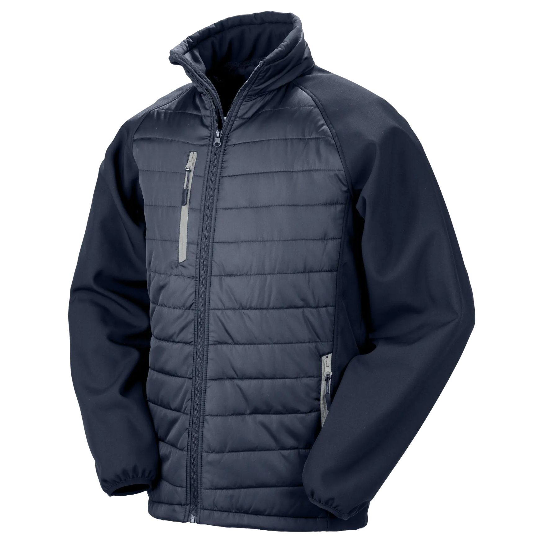 La chaqueta acolchada softshell Compass r237x combina un cuerpo acolchado con mangas softshell. El cuello alto acolchado, el protector de barbilla y los bolsillos con cremallera aportan una utilidad práctica en el día a día. El material exterior y el aislamiento incorporan poliéster reciclado.