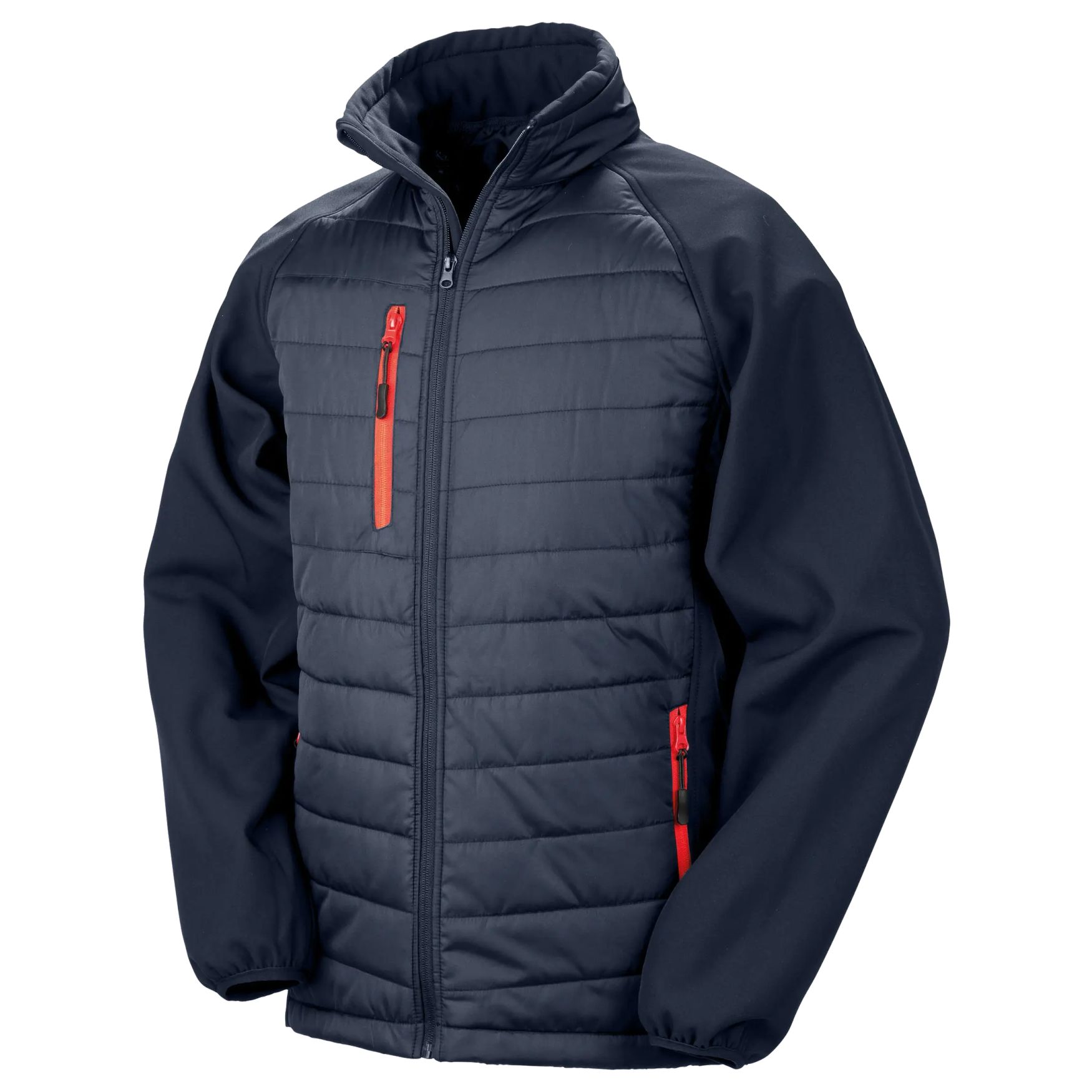 La chaqueta acolchada softshell Compass r237x combina un cuerpo acolchado con mangas softshell. El cuello alto acolchado, el protector de barbilla y los bolsillos con cremallera aportan una utilidad práctica en el día a día. El material exterior y el aislamiento incorporan poliéster reciclado.