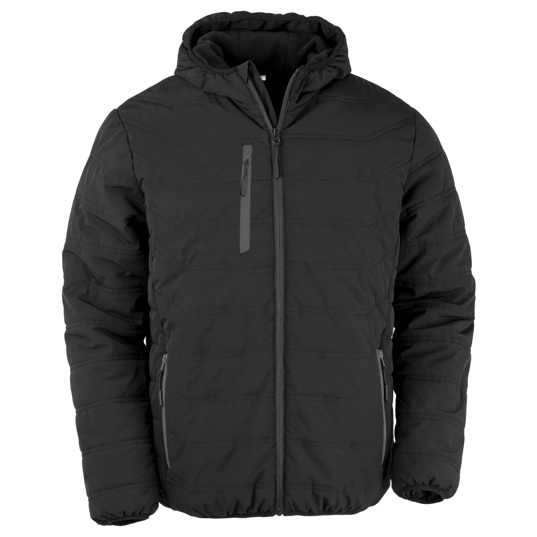 La chaqueta acolchada Black Compass es una chaqueta de invierno acolchada de tejido de poliéster reciclado, con forro polar y capucha forrada. El cierre delantero con cremallera con protector de barbilla, los bolsillos con cremallera y el bolsillo interior permiten un uso diario. Posibilidad de personalización.