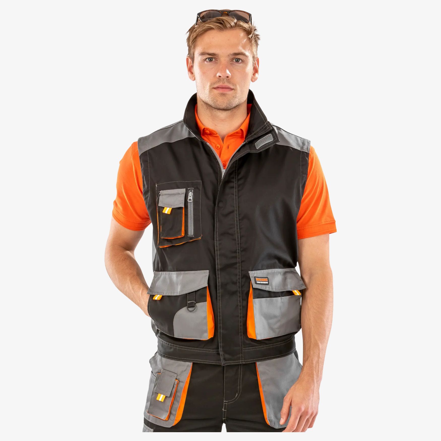 El Lite Gilet chaleco acolchado r317x, sin forro y ligero, es adecuado para el trabajo con tiempo caluroso. Corte amplio, transpirable, cortaviento y tejido resistente al agua, con cuello alto, cierre de cremallera y botones a presion. Bolsillos multiuso y costuras reforzadas en los puntos de tension.