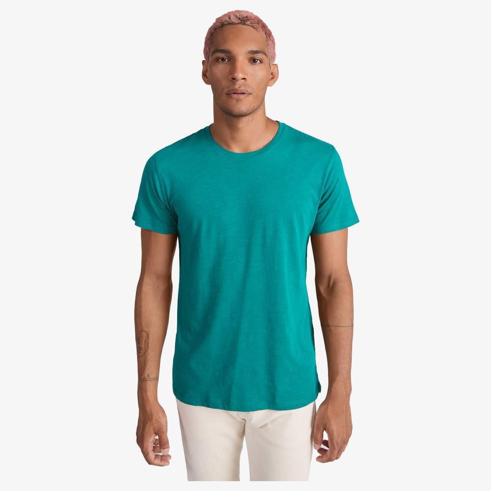 Camiseta de manga corta, confeccionada en tejido teñido inclinado. Presenta un cuello redondo a juego con un acabado decorativo de overlock. Una banda interior de limpieza contrastada se extiende de hombro a hombro para mayor comodidad. Las costuras laterales se realizan con un overlock decorativo para una mayor durabilidad. La parte inferior del vestido tiene aberturas laterales y una pieza dorsal ligeramente más larga que la parte delantera. La etiqueta es desmontable.