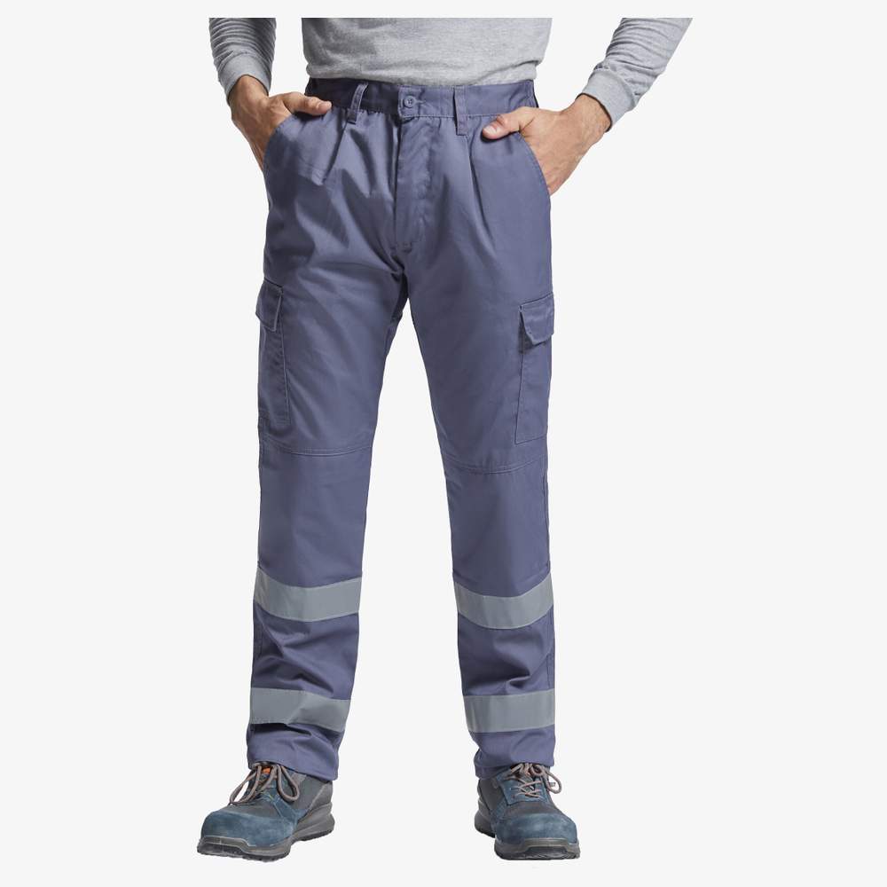 Pantalón de visibilidad en tejido resistente. Cinturón elástico ajustable en la espalda. Dos bolsillos delanteros. Bolsillo funcional trasero con solapa y cierre por banda autoagripante. Dos bolsillos laterales con solapa y cierre por banda autoagripante. Entrepierna reforzada. Doble tejido en las rodilleras. Dos bandas reflectantes horizontales. Parche de refuerzo trasero añadido. Certificación CE según las normas: EN ISO 13688:2013/A1:2021 EN17353:2020 Clase B2. Composición: 65% poliéster, 35% algodón sarga.