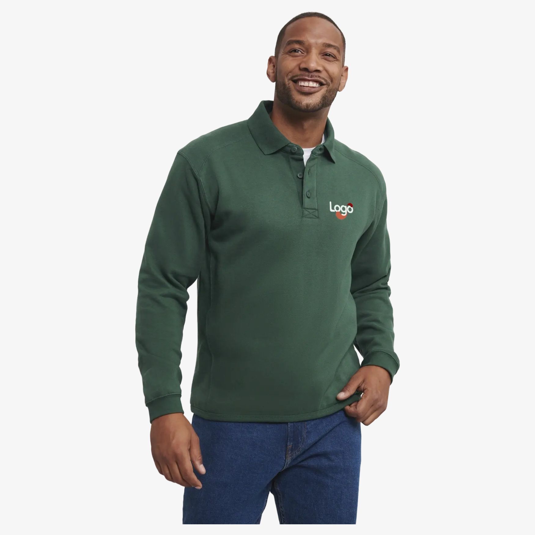 La sudadera de trabajo con cuello polo combina algodón peinado ringspun y poliéster con un revestimiento anti-manchas. Incluye hombros reforzados, porta bolígrafo elástico y ribete 1 x 1 con elastano en dobladillos y puños. Botones metálicos plastificados completan su diseño.