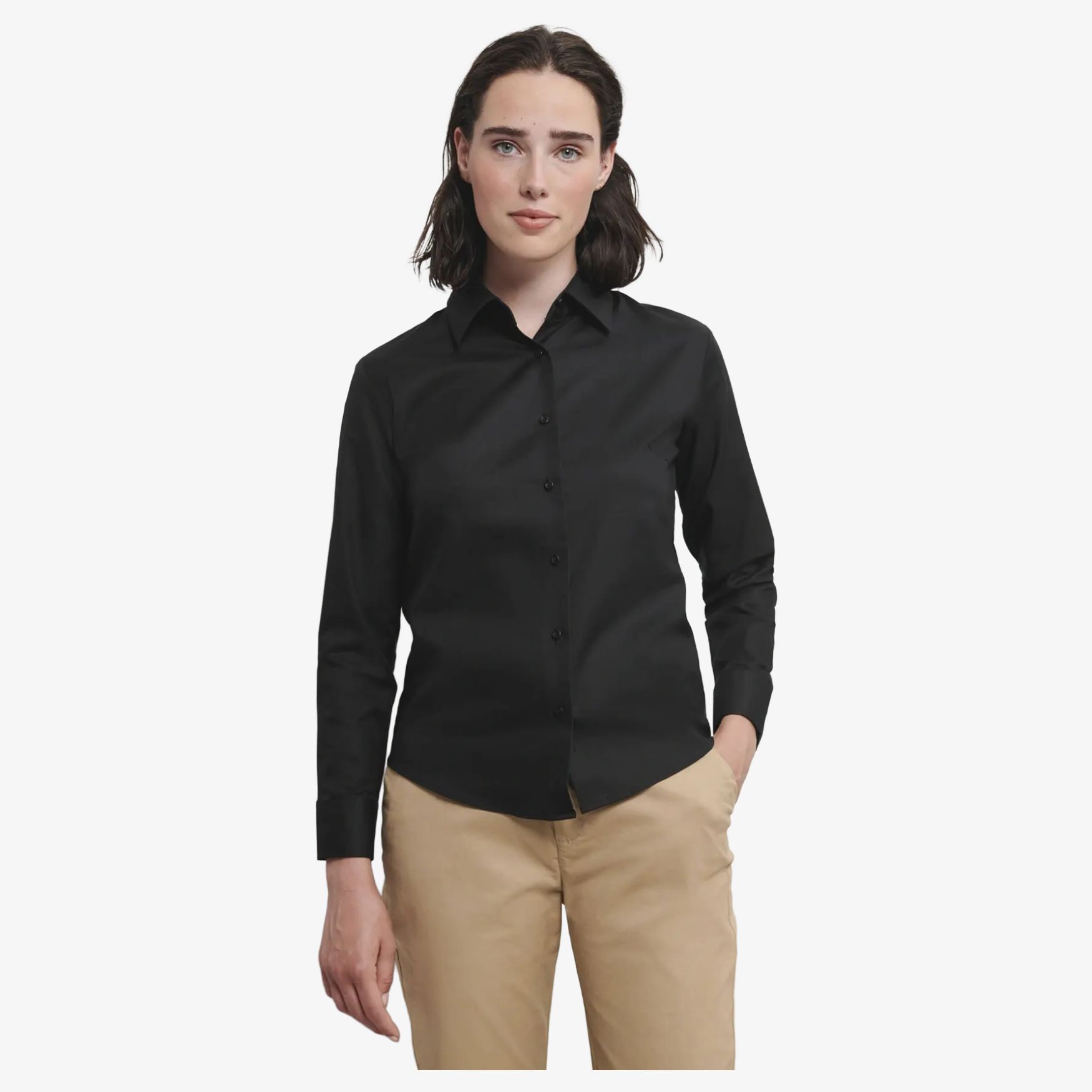 La camisa Oxford entallada de manga larga es adecuada para un uso diario o profesional, con 2 botones en el cuello, pinzas delanteras y traseras, bajo semiredondeado y puños redondeados ajustables.