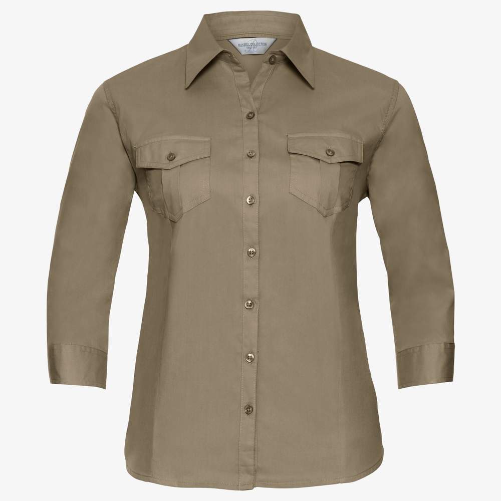 Camisa de manga tres cuartos y corte ajustado, diseñada en tela twill. Presenta un cuello cómodo y una solapa con botones en la parte delantera. Su diseño incluye costuras en la cintura y en el busto para una silueta favorecedora. Las mangas se pueden remangar con un botón exterior y una solapa interior. Está dotada de bolsillos con solapa y botón en el pecho.