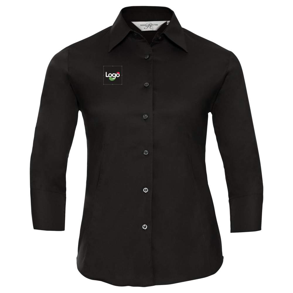 Camisa ajustada de algodón/elastano que ofrece comodidad y libertad de movimiento. Malla elástica para un uso agradable. Pinzas en la espalda y en el frente para un corte femenino favorecedor. Cierre con 7 botones del mismo color. Cuello clásico con botón único. Sin bolsillos. Mangas 3/4 con puños abiertos. Composición: Esta camisa es ideal para la personalización en bordado, permitiendo la adición de su logotipo o elementos gráficos para una imagen de marca coherente. Corte: Ajustado Manches: 3/4 Col: Clásico