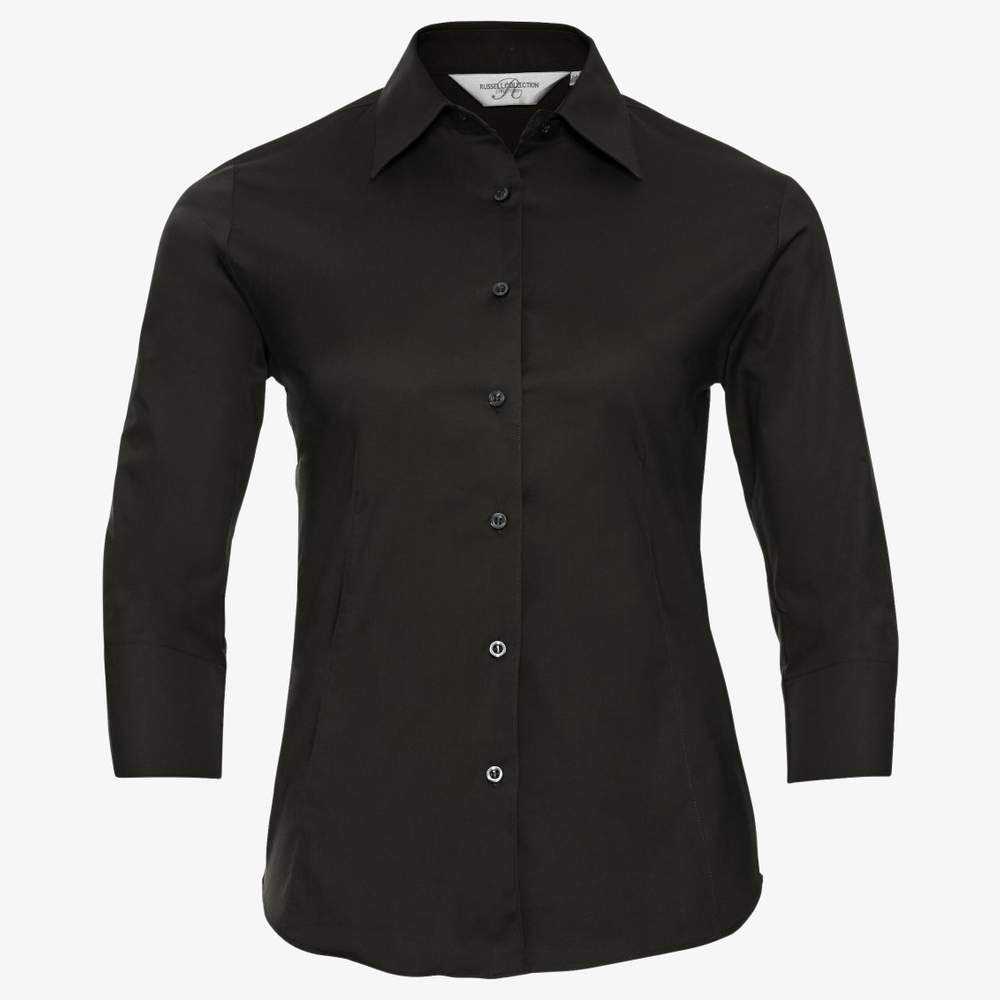 Esta camisa ajustada está confeccionada en algodón/elastano, ofreciendo un confort óptimo gracias a su malla elástica. Presenta pinzas en la espalda y en la parte delantera para un corte más femenino. Se cierra con 7 botones del mismo tono y tiene un cuello clásico con un solo botón. Este modelo está diseñado sin bolsillos y dispone de mangas 3/4 con puños abiertos.