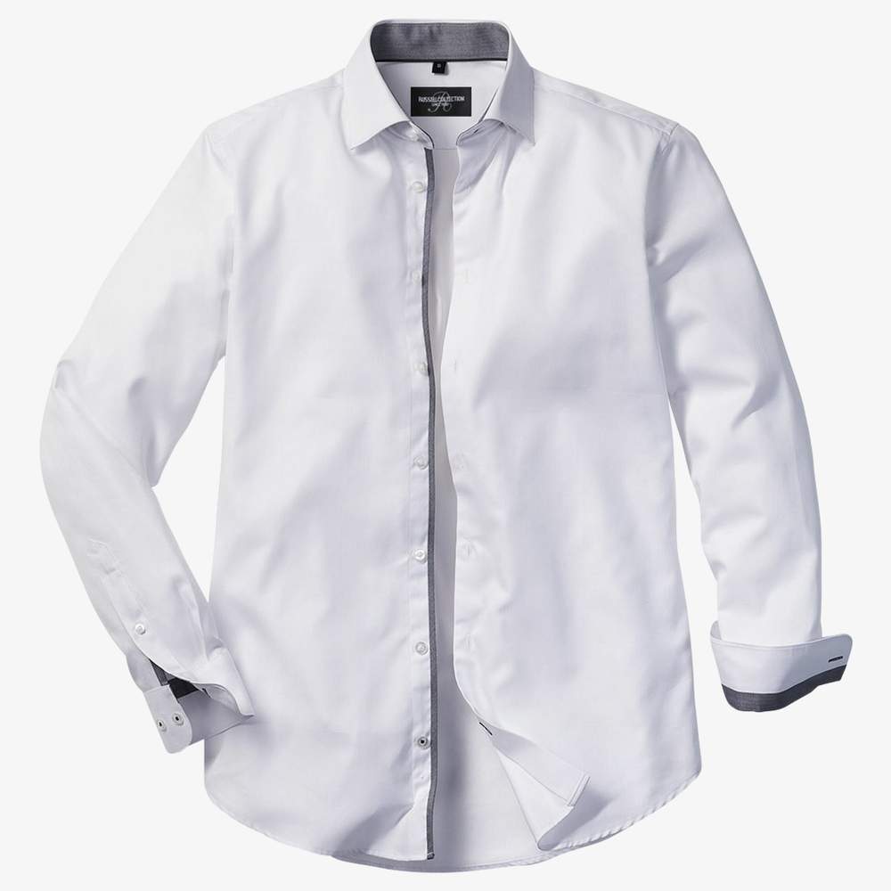 Esta camisa de manga larga presenta un corte ajustado para una silueta ajustada. Se distingue por contrastes de colores en los puños y el cuello, añadiendo un toque de sofisticación. El cuello abotonado asegura un soporte óptimo, mientras que el pliegue en la espalda contribuye a una mejor sujeción. El dobladillo redondeado proporciona un acabado pulcro. Los puños ajustables con dos botones permiten un ajuste personalizado.