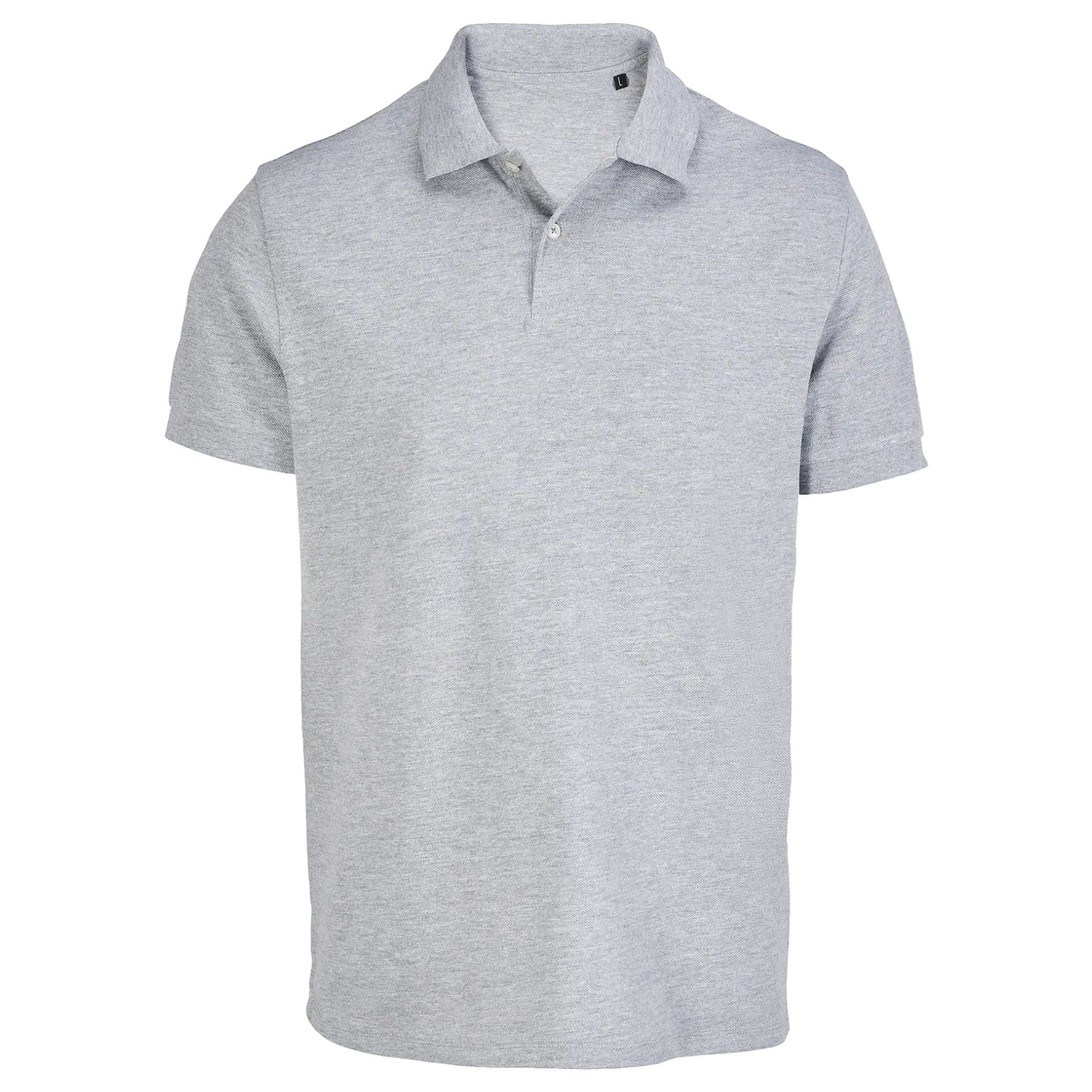 El polo unisex tiene un corte cómodo con mangas cortas y cuello bajo en canalé que contiene elastano. Está confeccionado con una cinta de refuerzo en el cuello y una tapeta de botones reforzada con dos botones color crudo. La parte inferior es recta con aberturas laterales reforzadas y un botón de repuesto colocado en la costura interior lateral. La composición es 100% algodón peinado Ringspun, excepto el color gris jaspeado que es 85% algodón y 15% viscosa.