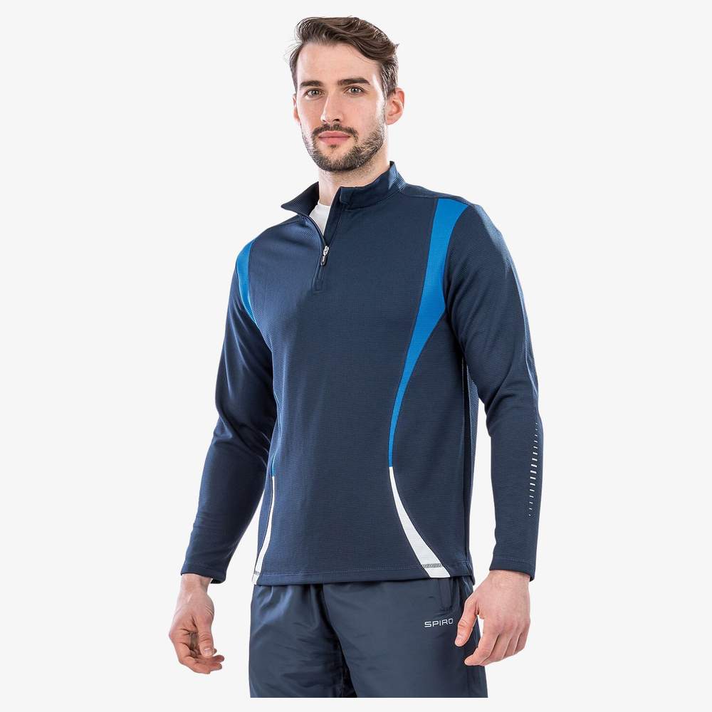 Chaqueta de entrenamiento ¼ zip confeccionada en 100% poliéster tejido respirante. Esta chaqueta de cuello zipper es ligera y ofrece un secado rápido, facilitando la práctica deportiva. Presenta un logo de la marca en la espalda sobre el cuello y paneles contrastados blancos en el frente. También hay paneles contrastados de diferente color presentes en el frente y la espalda.