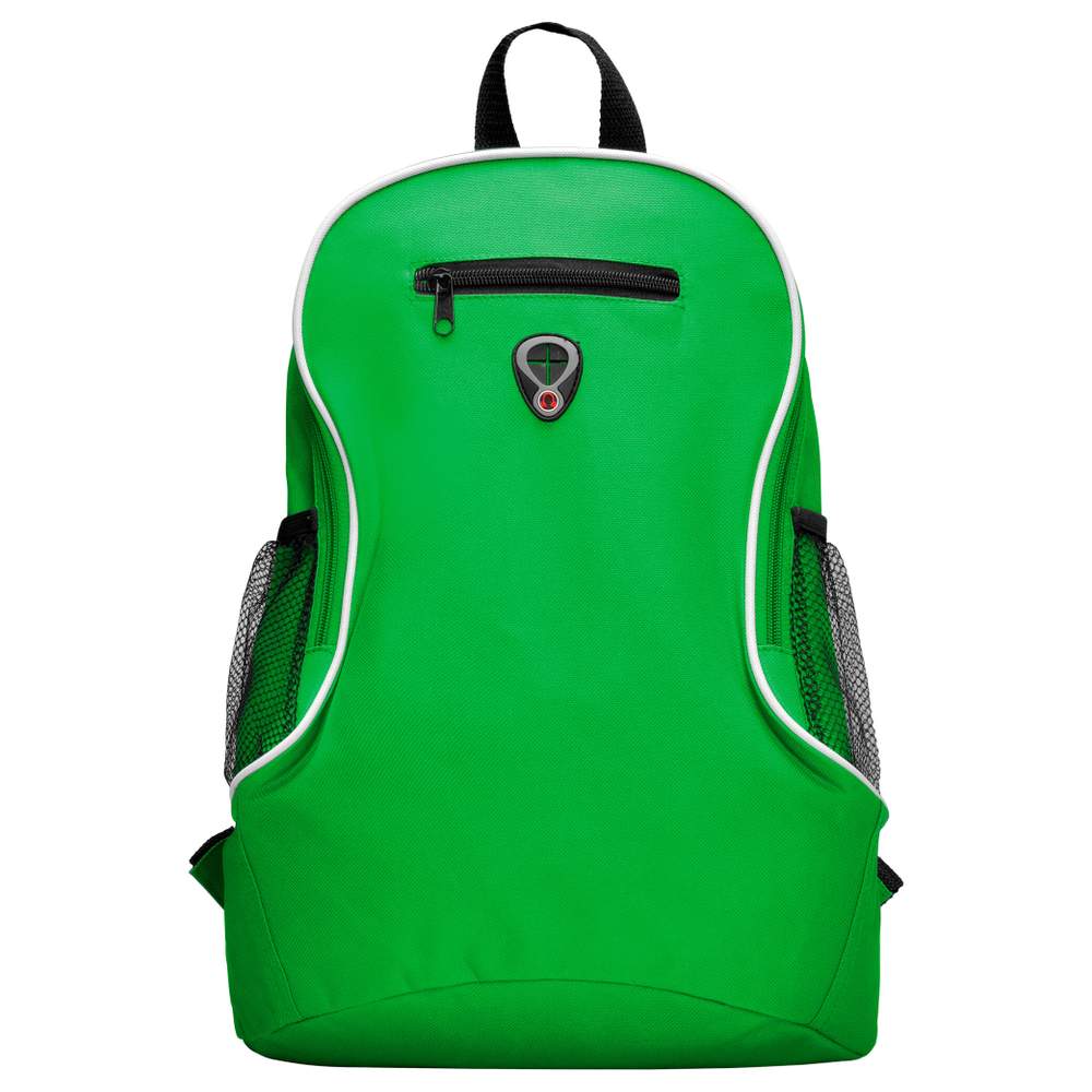 Mochila en poliéster con correas ajustables y una correa superior para una suspensión fácil. Cuenta con un bolsillo frontal con cremallera y bolsillos laterales de tela microperforada. Sus dimensiones son de 30 x 40 x 18 cm, ofreciendo una capacidad de 12 litros.