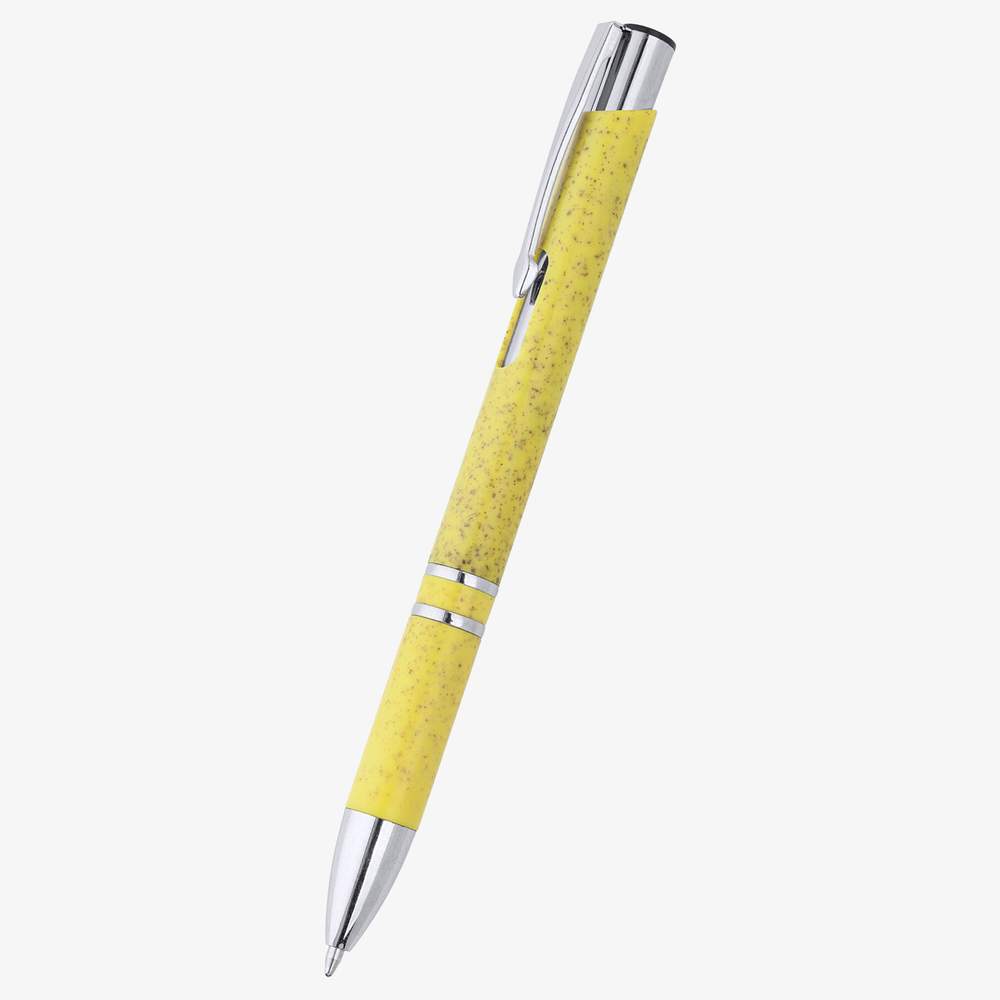 Bolígrafo con botón empujador en fibra de trigo y ABS con acabados plateados. Equipado con una recarga gigante de tinta azul, este bolígrafo ofrece una experiencia de escritura fluida y duradera. Su diseño ergonómico garantiza un agarre cómodo, mientras que sus materiales de calidad aseguran una larga vida útil.