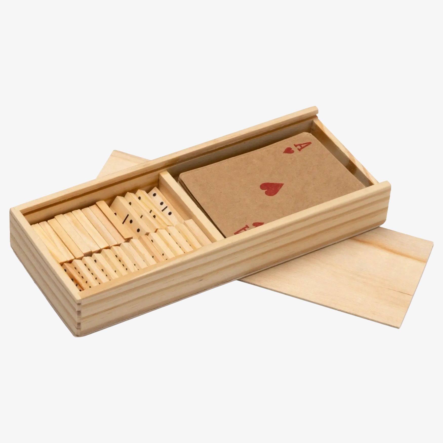 El conjunto de juegos Ludus reúne un juego de cartas de cartón reciclado y un dominó de madera, guardados en una caja de madera. Formato compacto, adecuado para partidas en casa o de viaje.