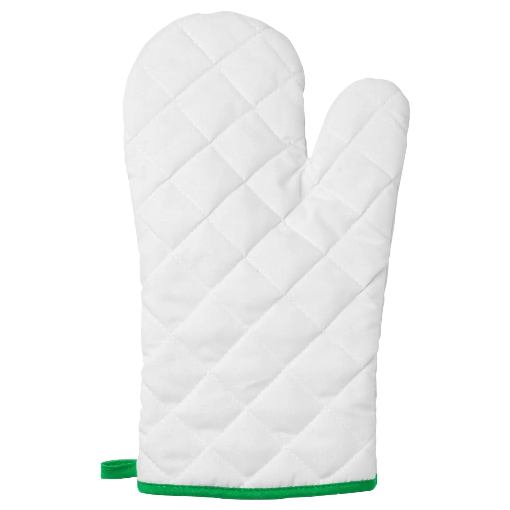 El guante de cocina Roger mp9134 de poliester, con acabado blanco y bordes de colores. Cinta para colgar y lado liso. Dimensiones 19 x 30,5 cm.