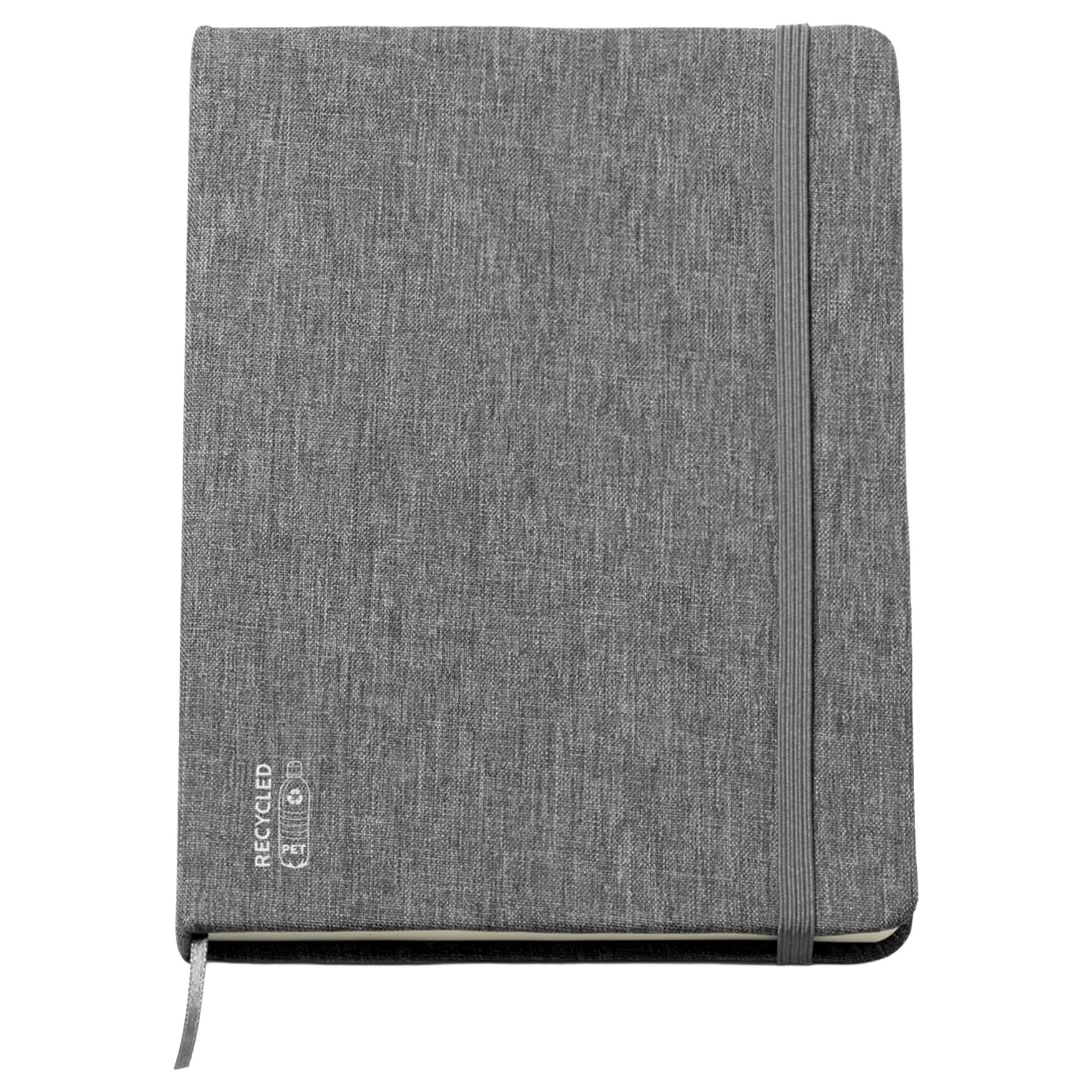 The SOYER notebook includes a hard RPET cover and an elastic band serving as a bookmark. It contains 80 sheets for various uses. Dimensions are 14.7 x 21 x 1.5 cm.